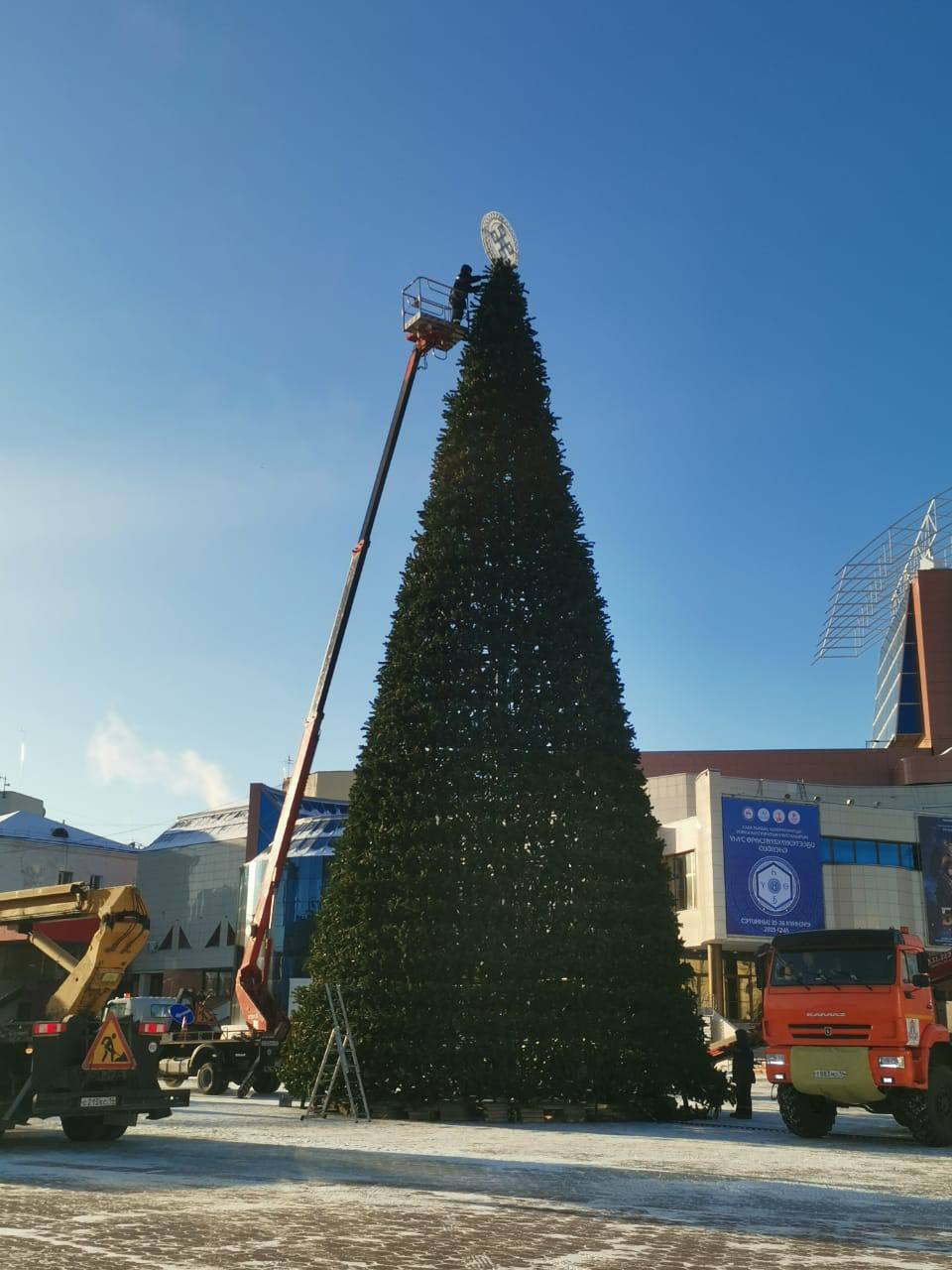 На площади Орджоникидзе в Якутске начали украшать новогоднюю елку.