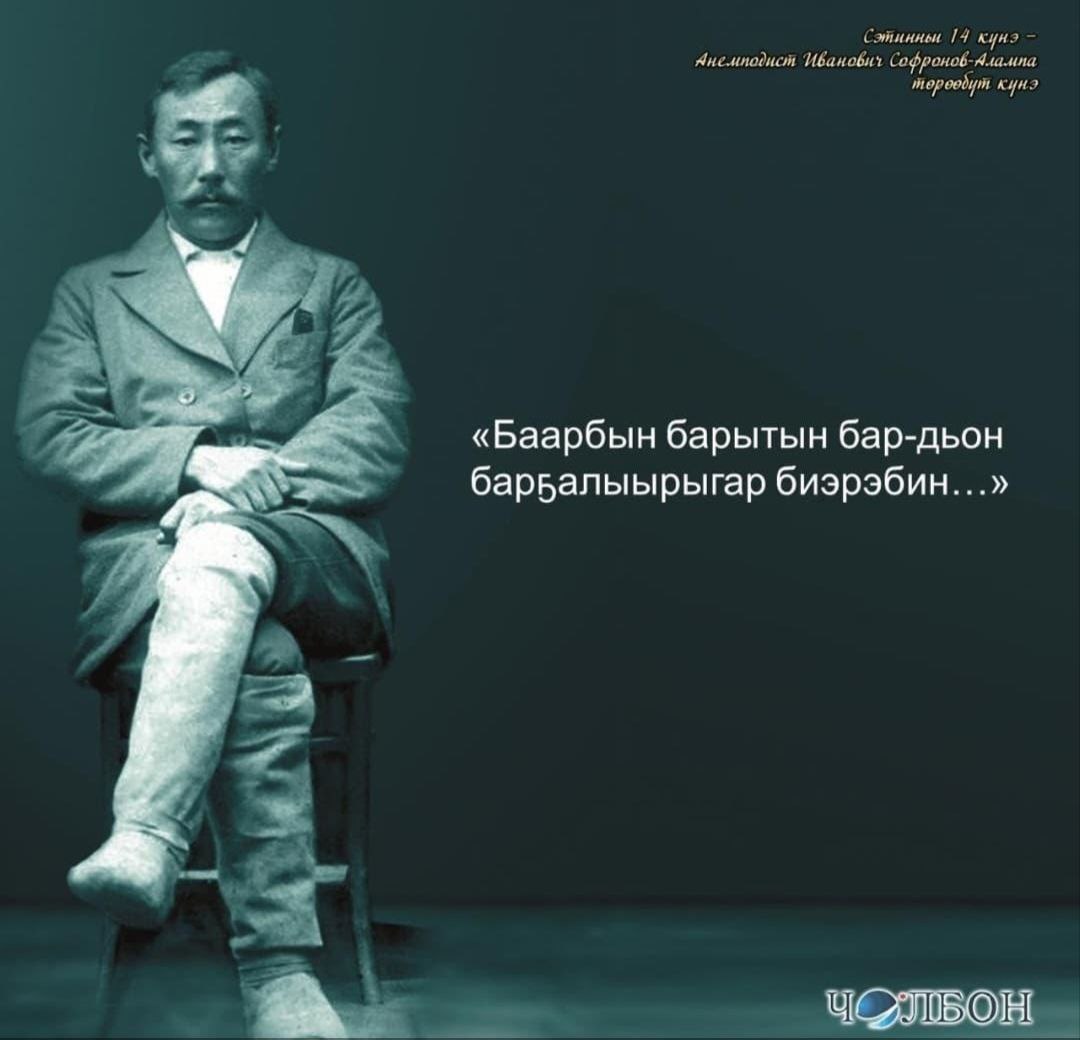 Сегодня День рождения первого поэта-лирика, который стоял у истоков становления Сахатеатра, национальной газеты «Манчаары» и журнала «Чолбон», члена ЦИК Якутской АССР, председателя культурно-просветительного общества «Саха омук», учредителя научно-исследовательского общества «Саха кэскилэ» Анемподиста Софронова- Алампа.