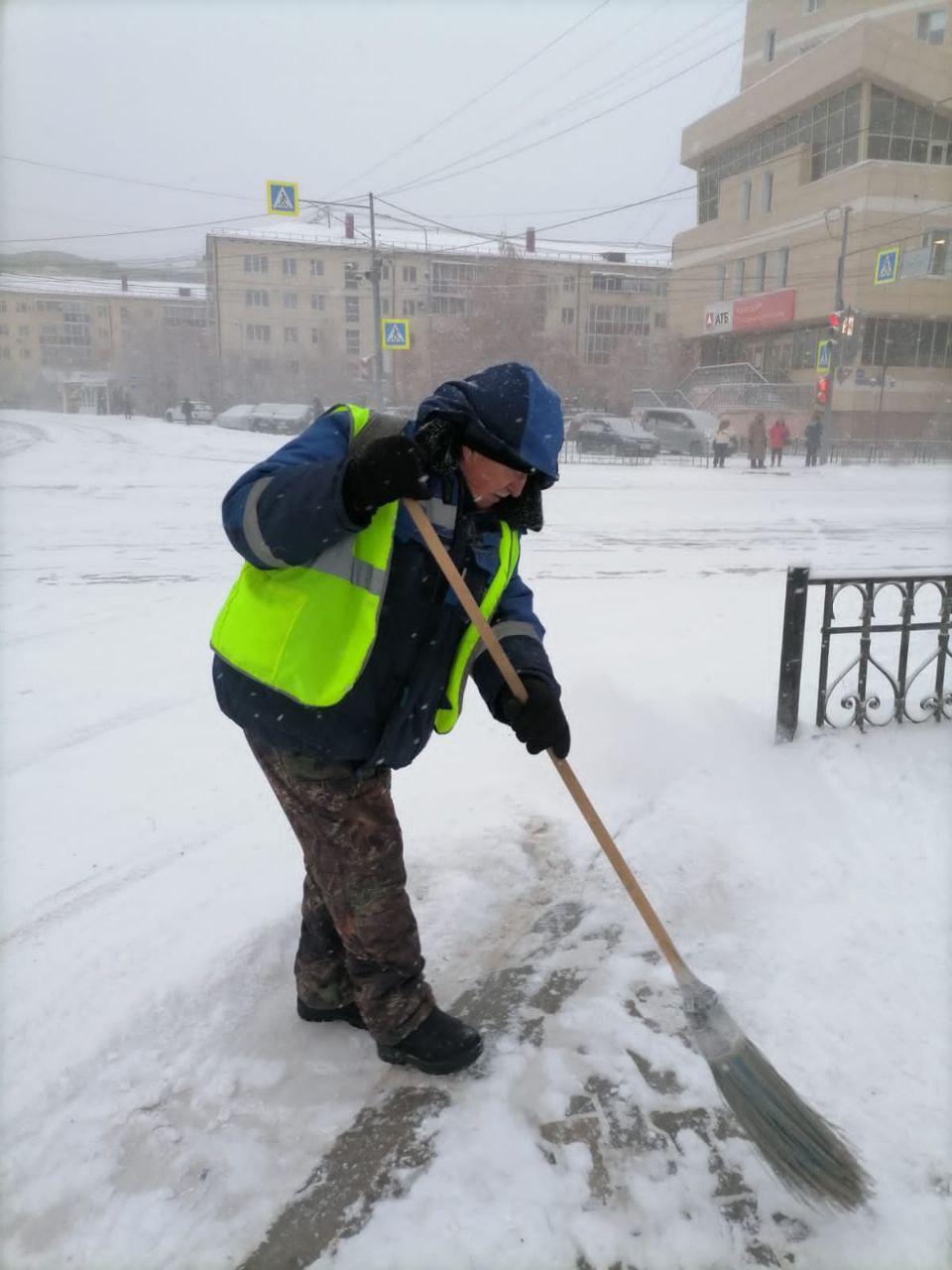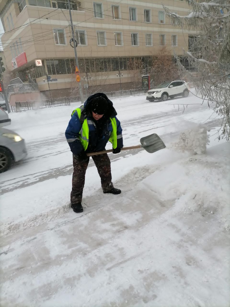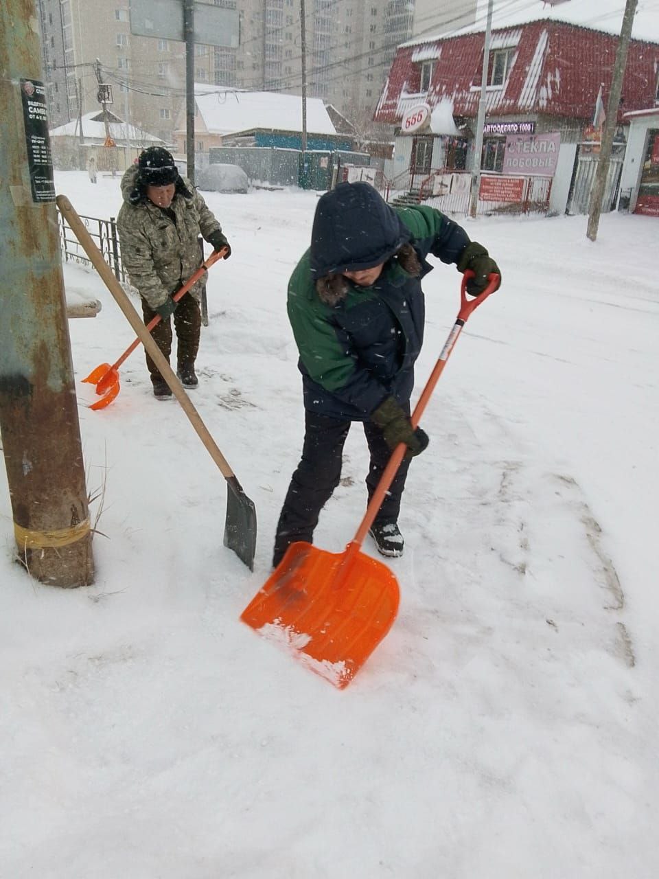 С лопатами, щетками и метлами с утра они дружно очищают о снега тротуары, автобусные остановки, скверы, памятники и пешеходные переходы.