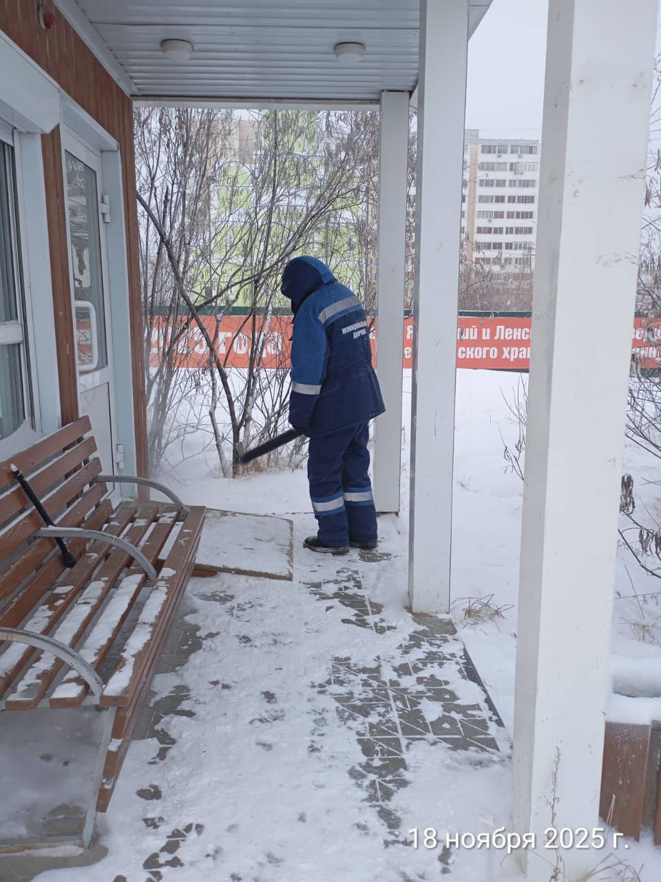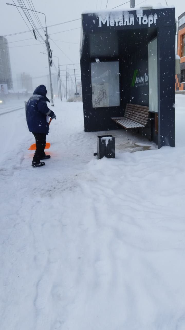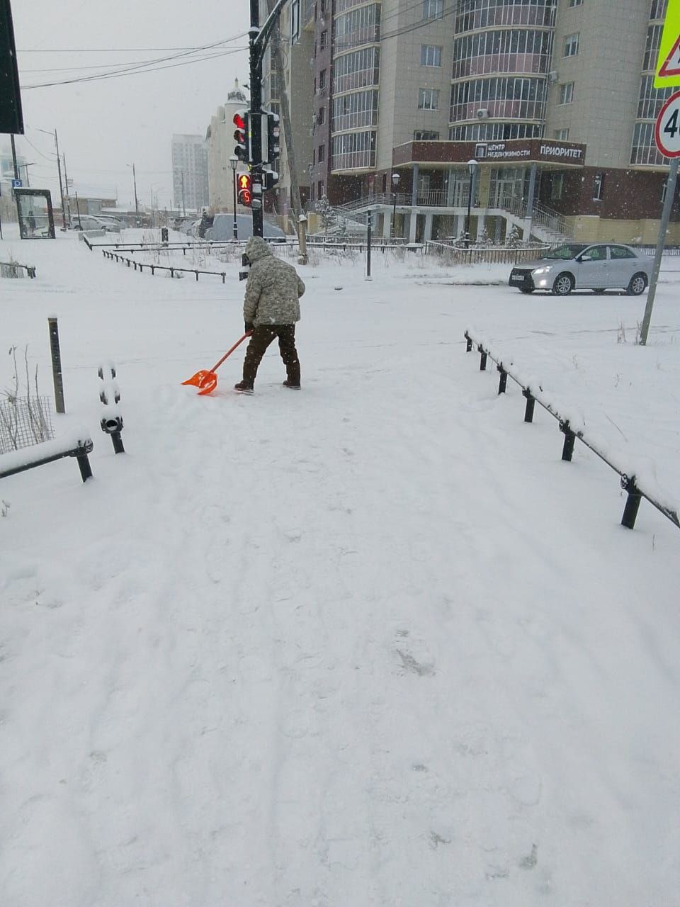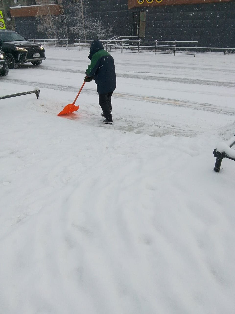 С лопатами, щетками и метлами с утра они дружно очищают о снега тротуары, автобусные остановки, скверы, памятники и пешеходные переходы.