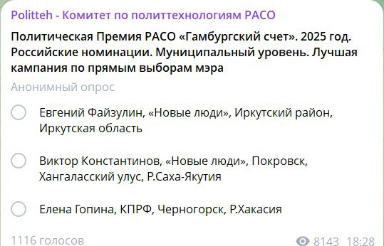 Как видим в третьем скрине, РАСО объявили голосование за лучшую муниципальную практику кампанию по прямым выборам мэра. Среди кандидатов есть Виктор Константинов из Покровска. Но студентов видимо просят проголосовать за другого кандидата.