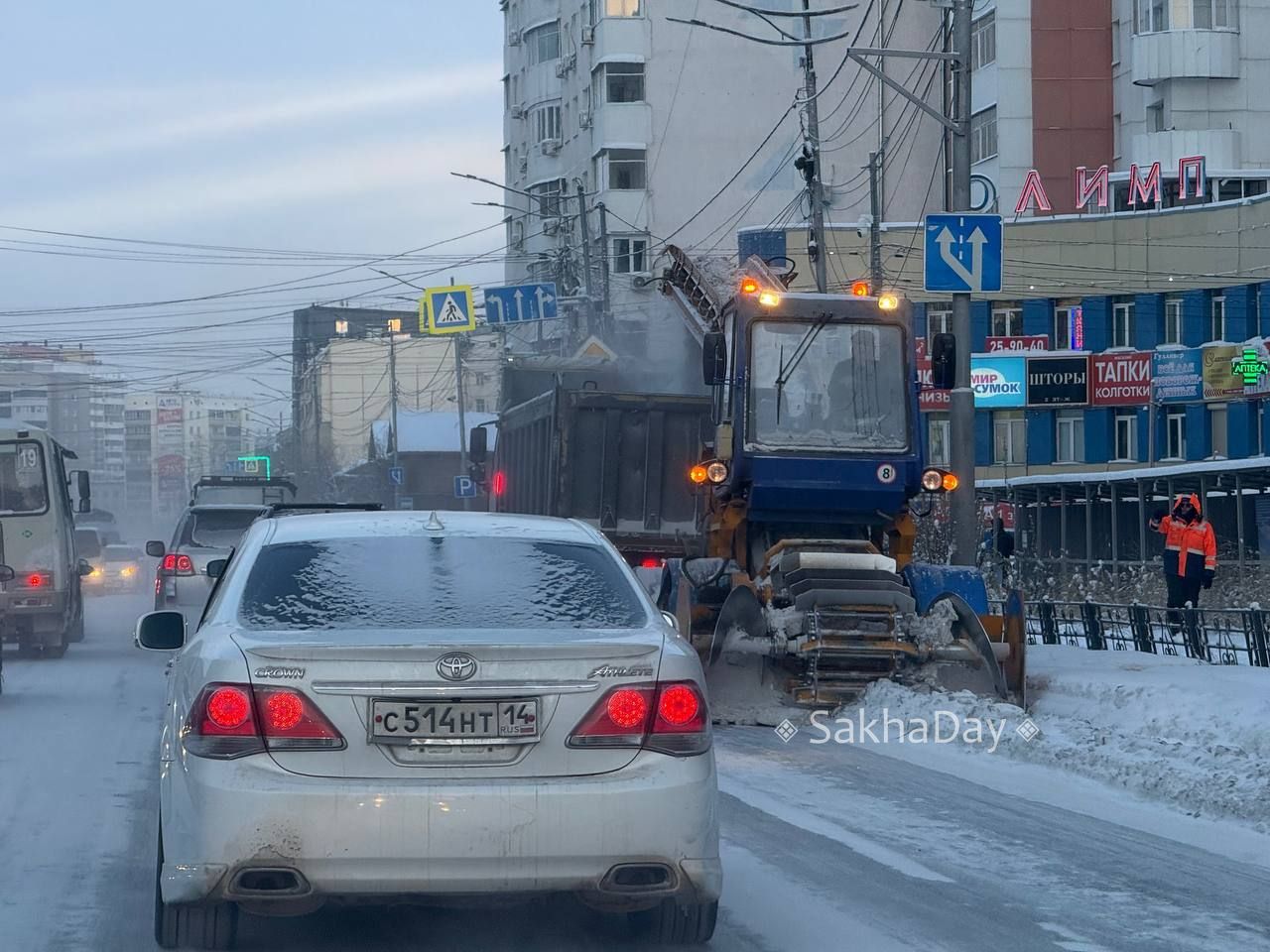 Пробка на Лермонтова, чистят снег. #дляsakhaday