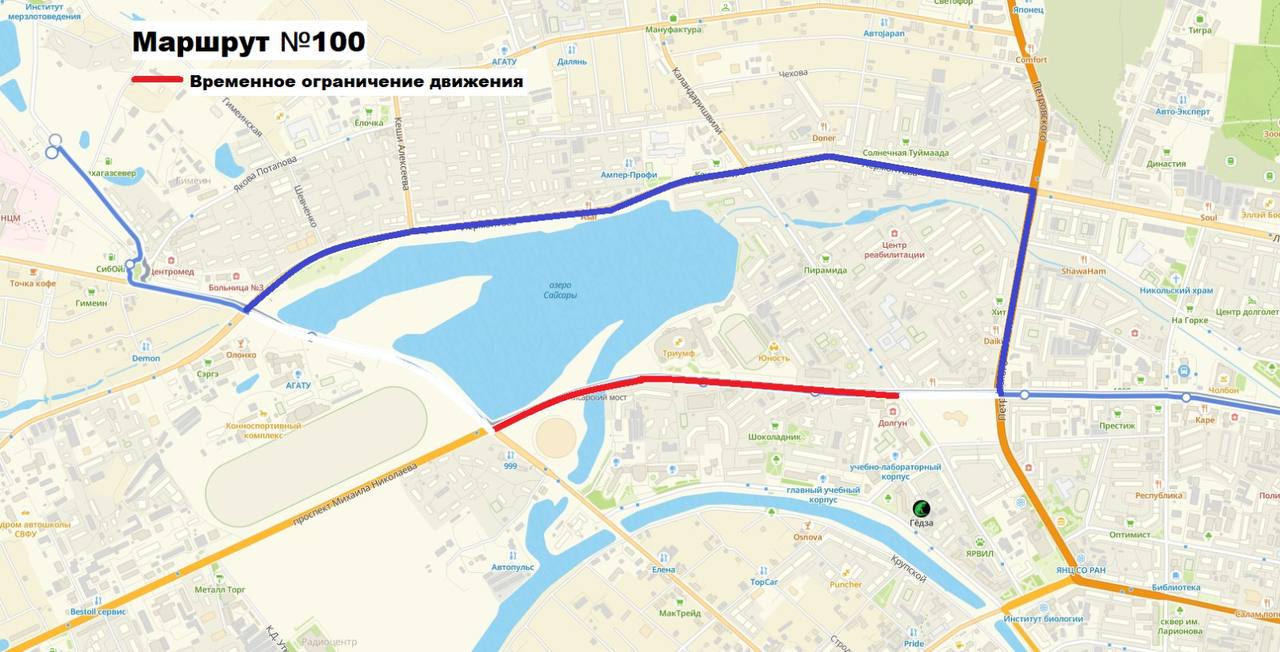 Схема объезда ул. Ойунского, маршрут 100.