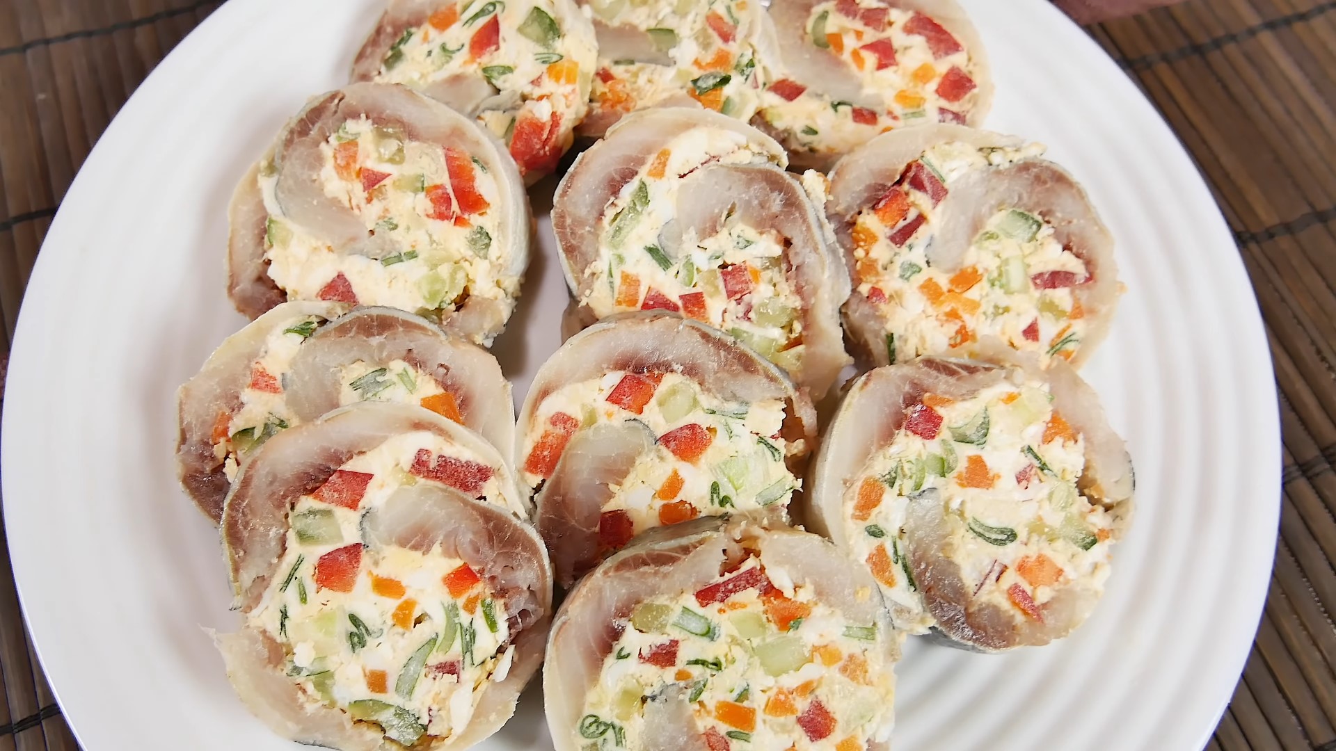 Положите всю начинку на одну часть филе. Закройте второй, сформируйте рулет и обмотайте его пищевой пленкой. Уберите в холодильник на час, после этого разрежьте и подавайте на стол, делится рецептом портал «Повар.ру».
