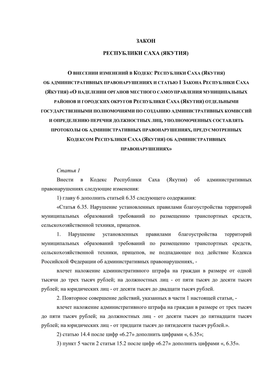 Принята законодательная инициатива народного депутата Республики Саха (Якутия) Александра Кошукова о дополнении КоАПа Республики Саха (Якутия) статьей, устанавливающей ответственность за нарушение установленных правилами благоустройства территорий муниципальных образований требований по размещению транспортных средств, сельскохозяйственной техники, прицепов.