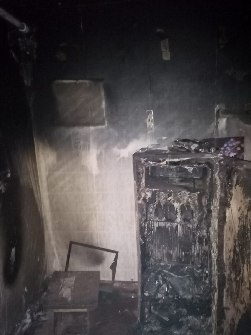 В результате пожара повреждены старый холодильник и обои на площади около 1 м каждое, общая площадь повреждения составила 2 м. Пострадавших нет, огнем повреждено домашнее имущество. Жилой дом спасен.