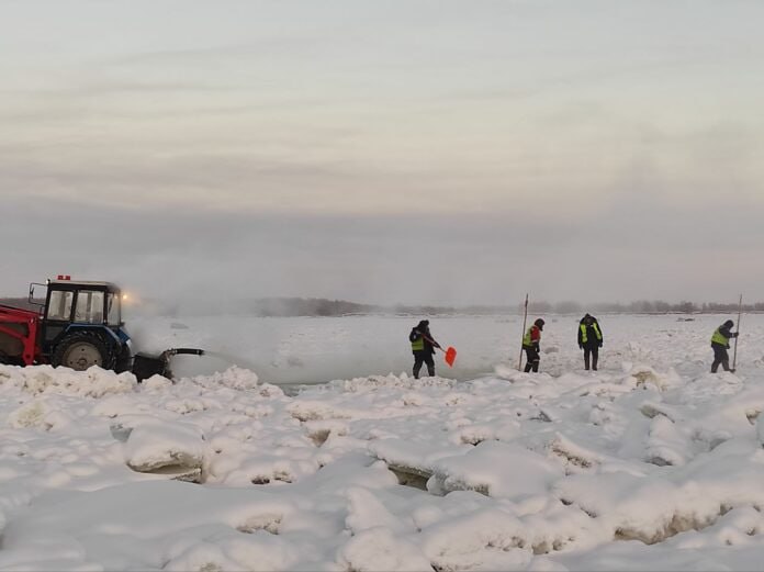 Работы по повышению грузоподъемности ледового автозимника через Лену по маршруту «Хатассы – Павловск».