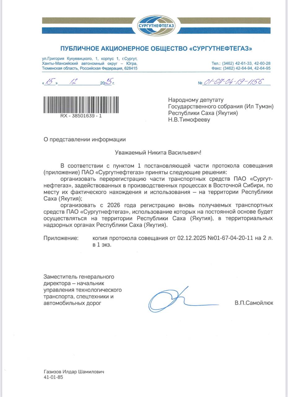 «Благодарим руководство ПАО «Сургутнефтегаз» в лице генерального директора В.Л.Богданова, заместителя генерального директора — начальника управления технологического транспорта, спецтехники и автомобильных дорог В.П.Самойлюк за принятое решение», — пишет Василий Николаев.