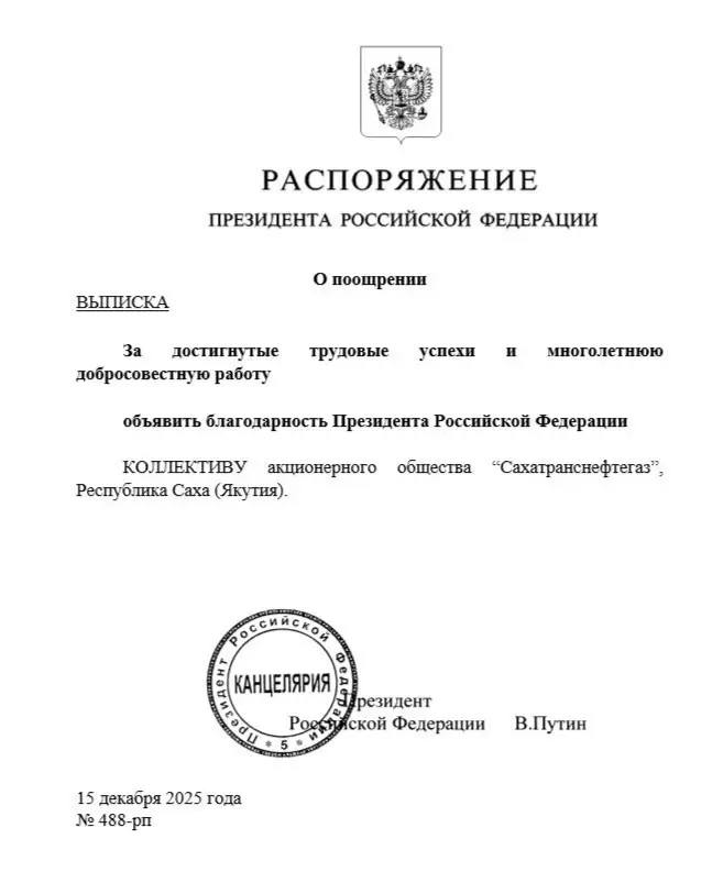 Коллектив АО «Сахатранснефтегаз» отмечен Благодарностью Президента Российской Федерации.
