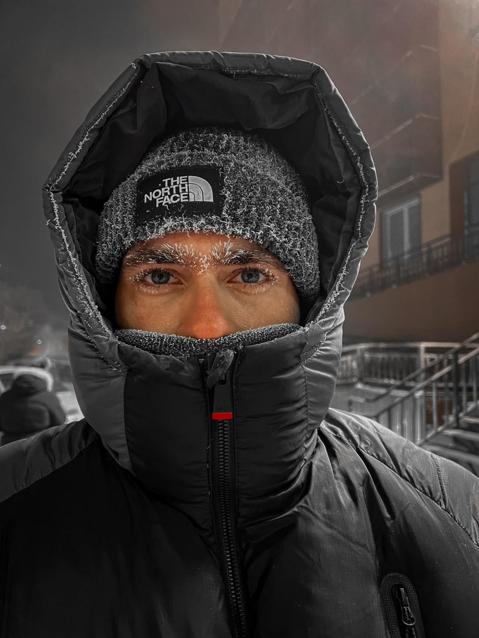 "Я наконец приземлился в Якутске, самом холодном городе на Земле. -43°C сегодня, и может опуститься до -70°C.Это я после всего 7 минут на улице. У моего телефона была 60% аккумулятора и он сел за 3 минуты. Он буквально замерз, кнопки громкости даже не нажимают. Дверь моего приюта, как видите на видео, покрыта льдом, и на нее вешают одеяло, чтобы холод не подкрался.