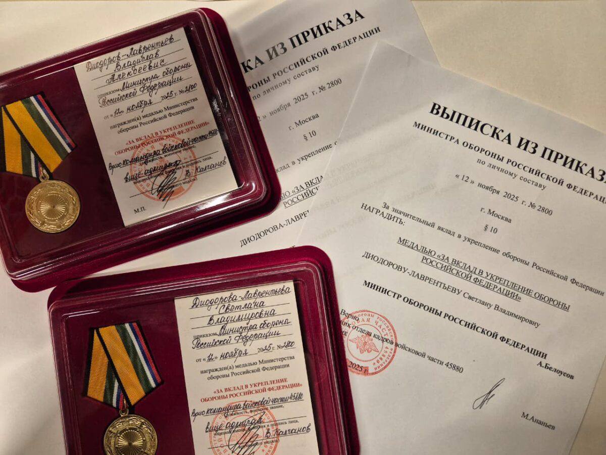 Светлану и Владислава Диодоровых-Лаврентьевых наградили ведомственными медалями Министерства обороны «За вклад в укрепление обороны Российской Федерации».