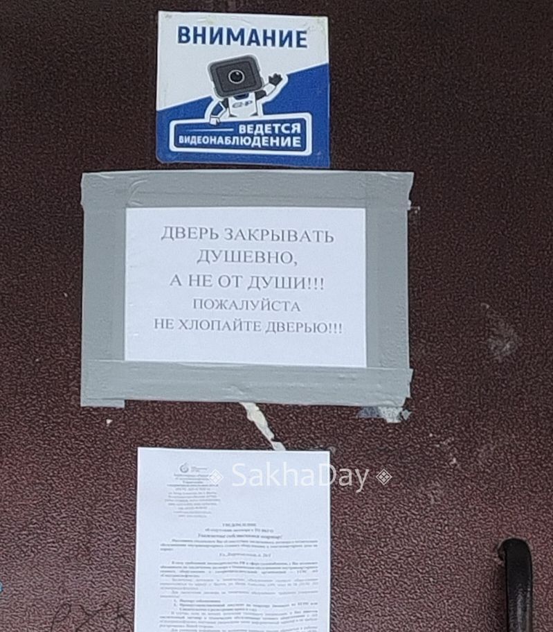 Обычно на шум от входных дверей жалуются жильцы квартир на первом этаже. Это объявление висит в КПД.