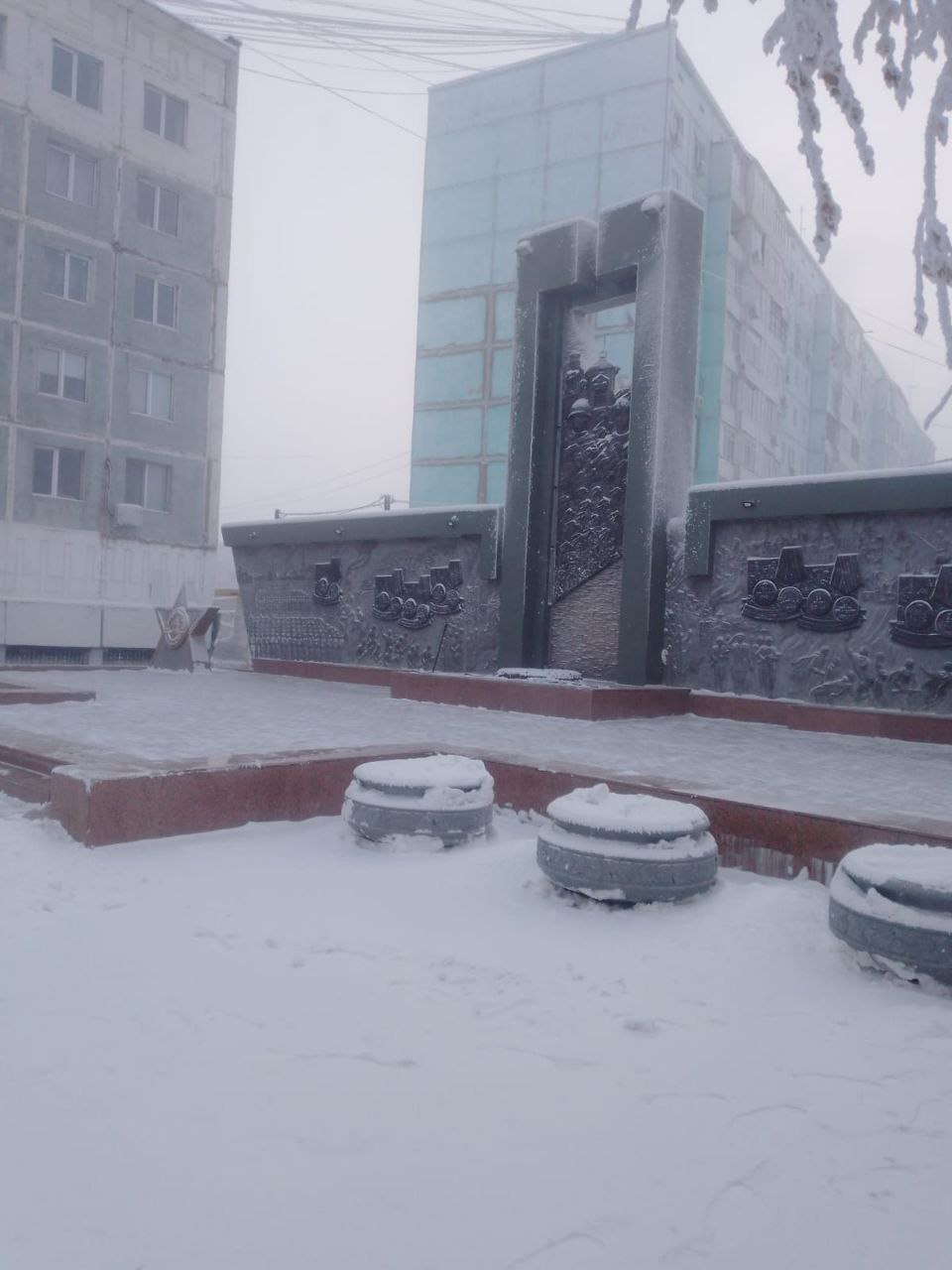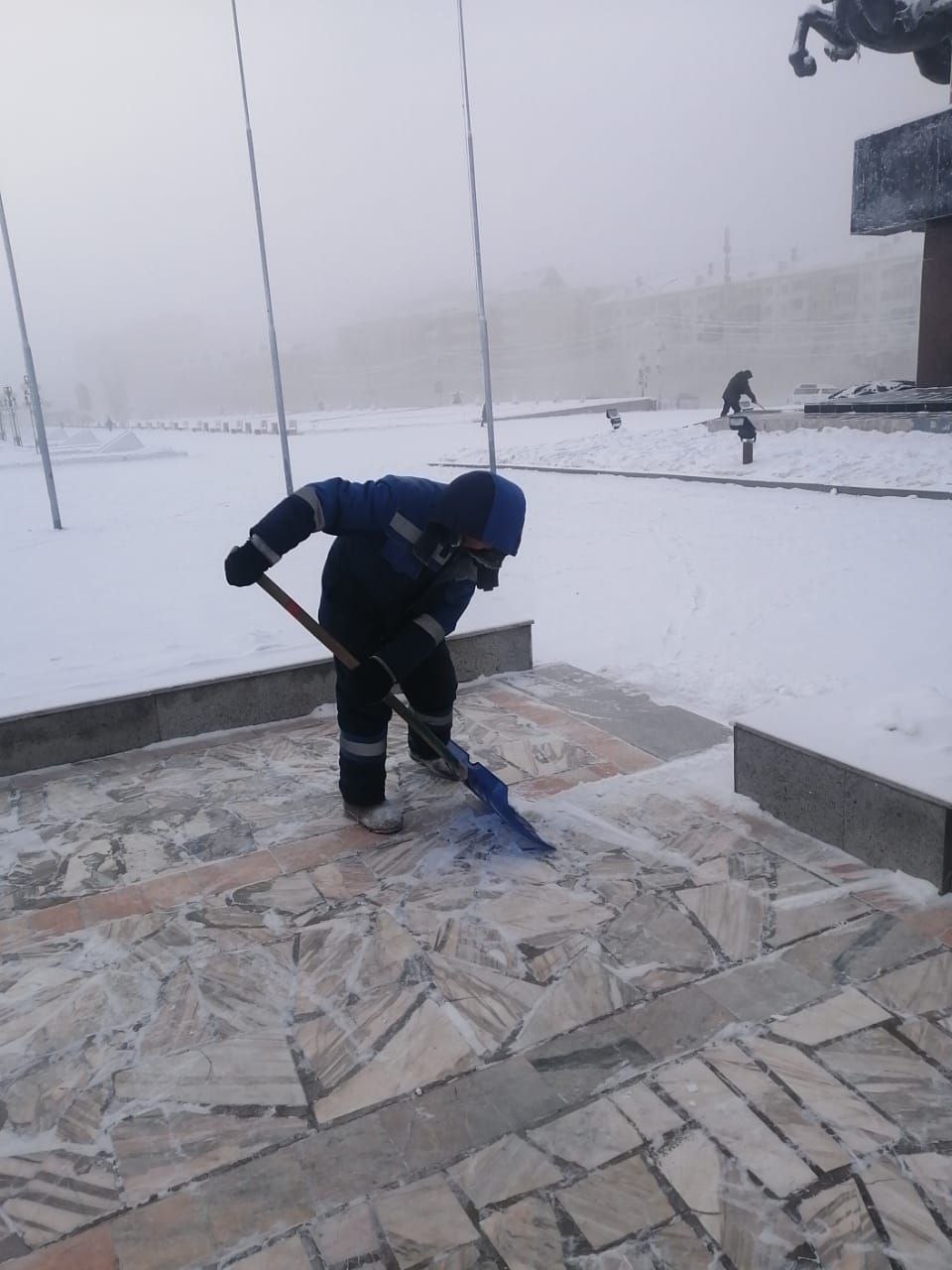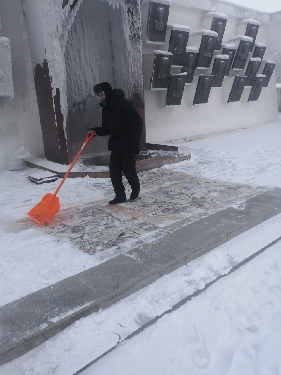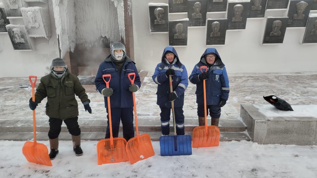 Вокруг мемориала дворники ведут свою тихую зимнюю работу: осторожно очищая снег, они сохраняют память поколений в чистоте и порядке, подчеркивая уважение и почтение к истории