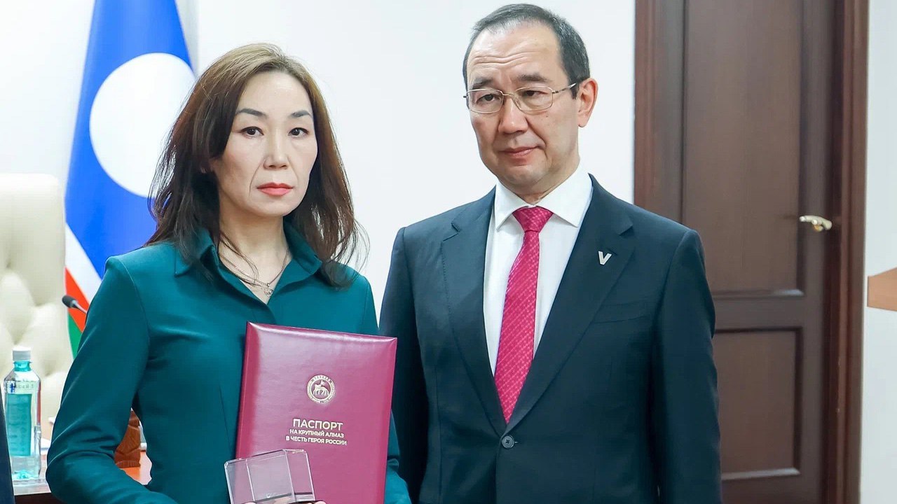Глава Якутии вручил вдове Героя России Дмитрия Егорова копию именного алмаза.
