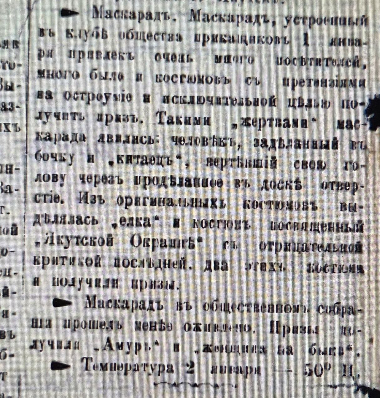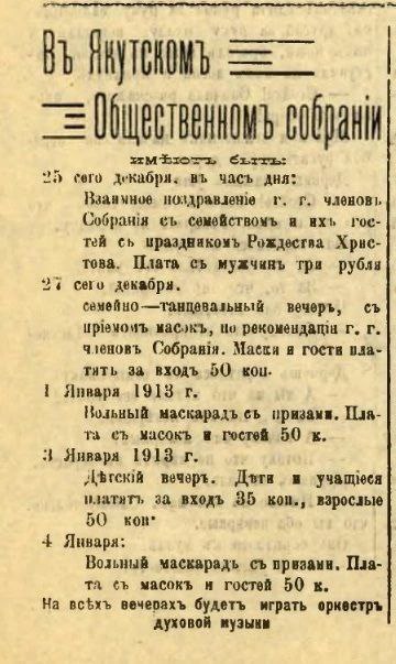 С 21 декабря по 5 января (по ст.ст.) в Якутске начинались святки. Горожане наряжались во всевозможные маскарадные костюмы и в сопровождении музыкантов с темнотой разъезжали по городу - искали зажженые фонари. Вывешенный над воротами фонарь обозначал приглашение, которое давало право заезжать в дом на угощение и танцы всем «маскам». Могли быть и знакомые, и незнакомые, хозяева даже порой не знали кто у них гостил, ел-пил. И такие маскарадные гуляния продолжались всю ночь. После 1905 г. традиция домашних приемов ряженых стала пропадать. Взамен в праздники открывались двери для маскарада в клубе приказчиков и в Благородном собрании. А какие были маскарады и маски читайте на скринах. Хорошего отдыха!