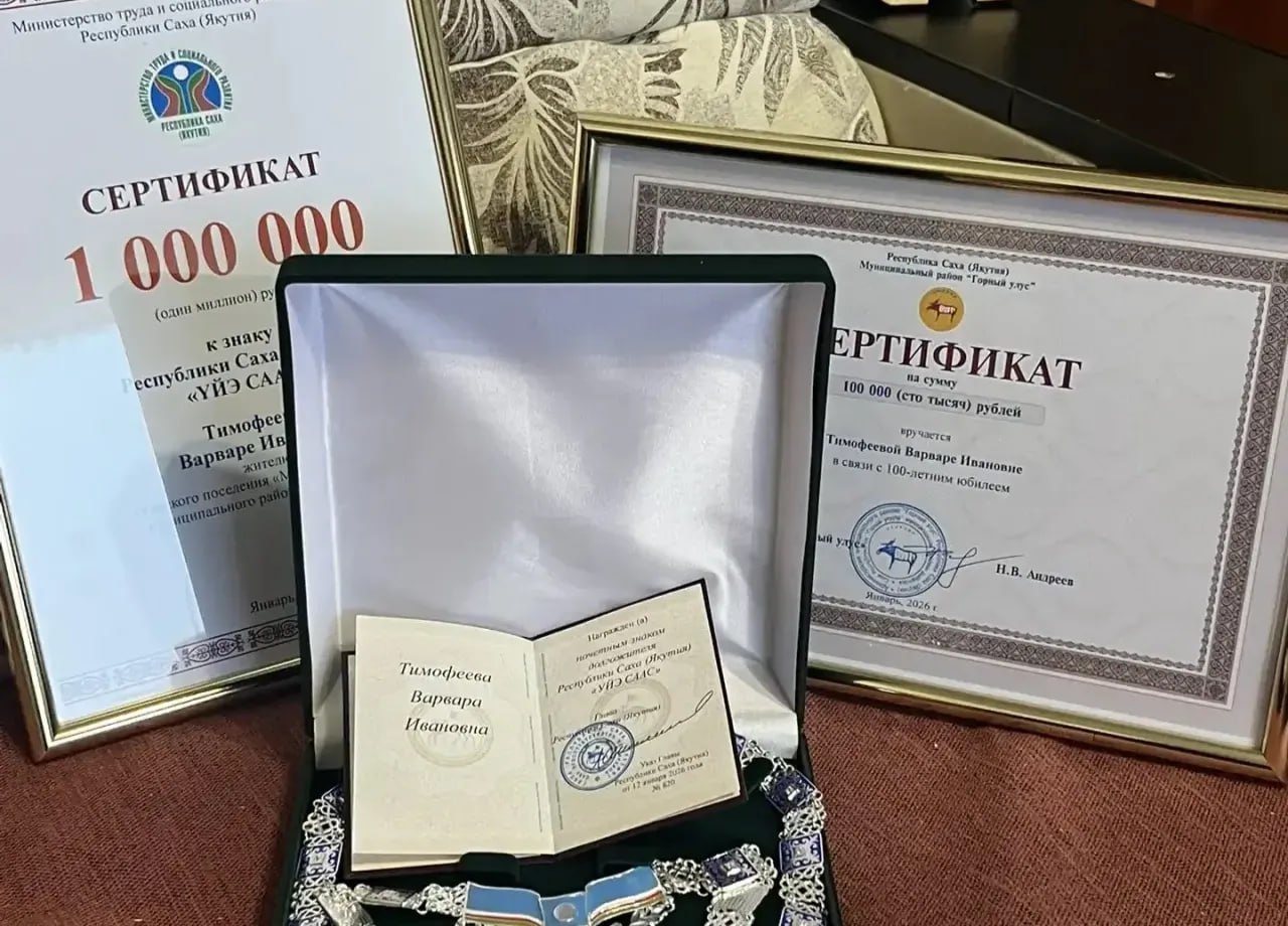 От имени главы республики Айсена Николаева Варваре Ивановне вручили официальное поздравление и почетный знак долгожителя республики «йэ саас», к которому прилагается выплата в размере 1 миллиона рублей.