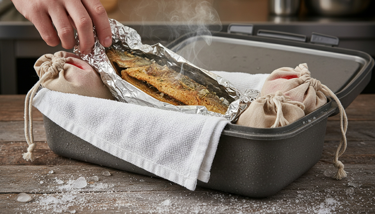 При морозах важно эффективно сохранить тепло. Для этого потребуется предварительно прогреть контейнер, в котором будет находиться рыба. Оберните ее в фольгу и полотенце ? это поможет сохранить тепло. Лосось можно удерживать теплым до 90 минут при правильной подготовке.