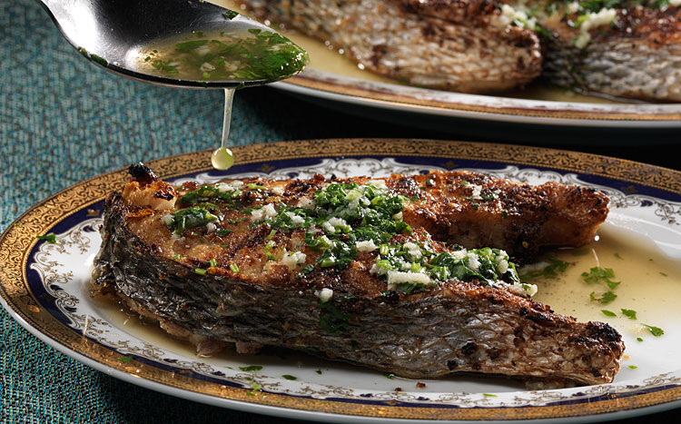 Рыбу можно нарезать на стейки толщиной около двух пальцев и обсыпать смесью из соли, панировочных сухарей и специй. При жарке на мангале важно следить за температурой углей, чтобы корочка на рыбе образовалась, а внутри она осталась сочной и нежной.