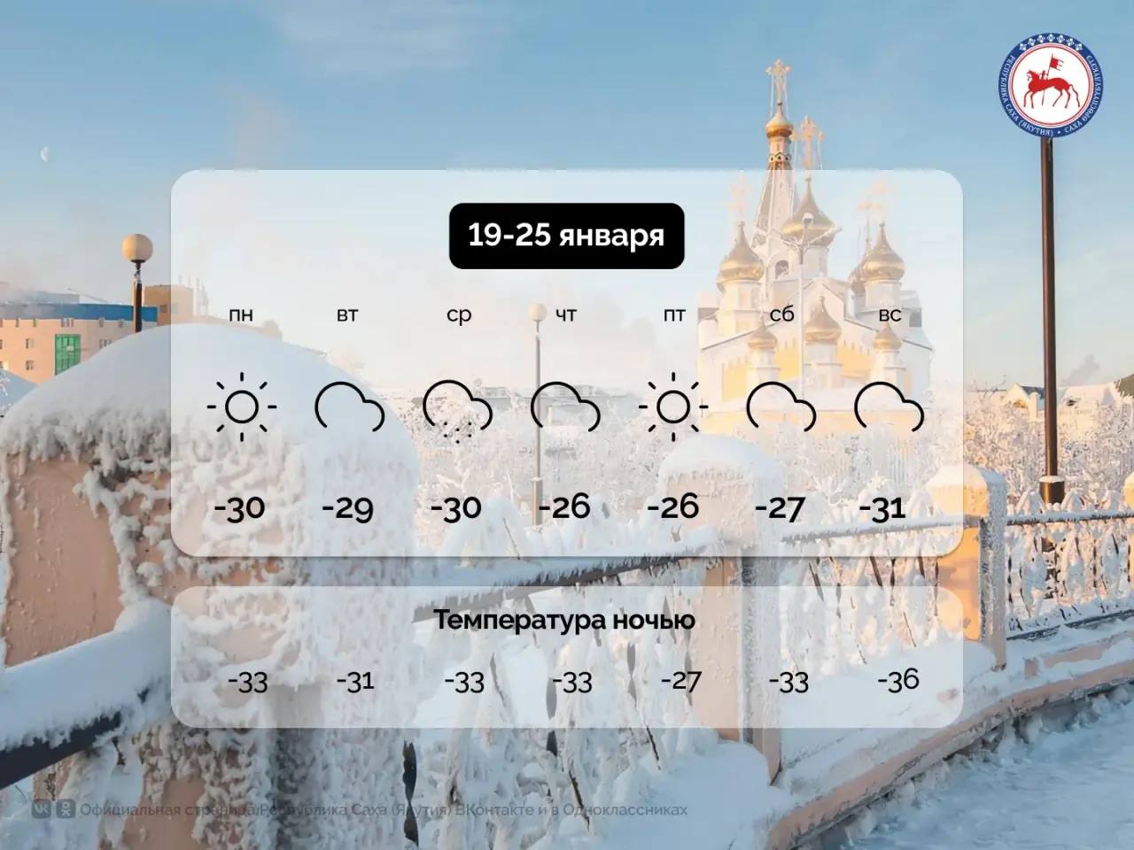 Согласно прогнозу Росгидромет, в период с 19 по 25 января в столице республики, Якутске, преимущественно безоблачно.