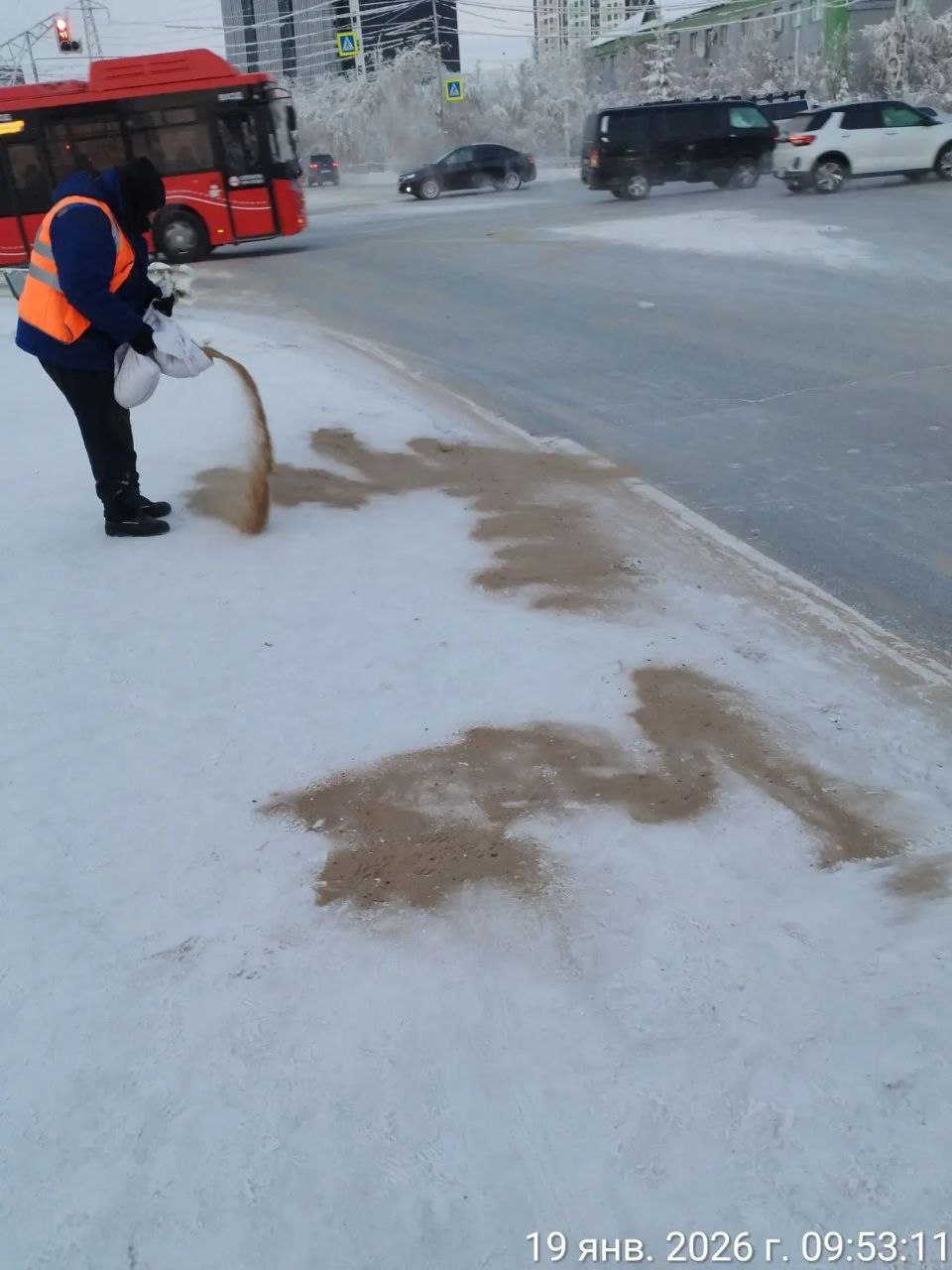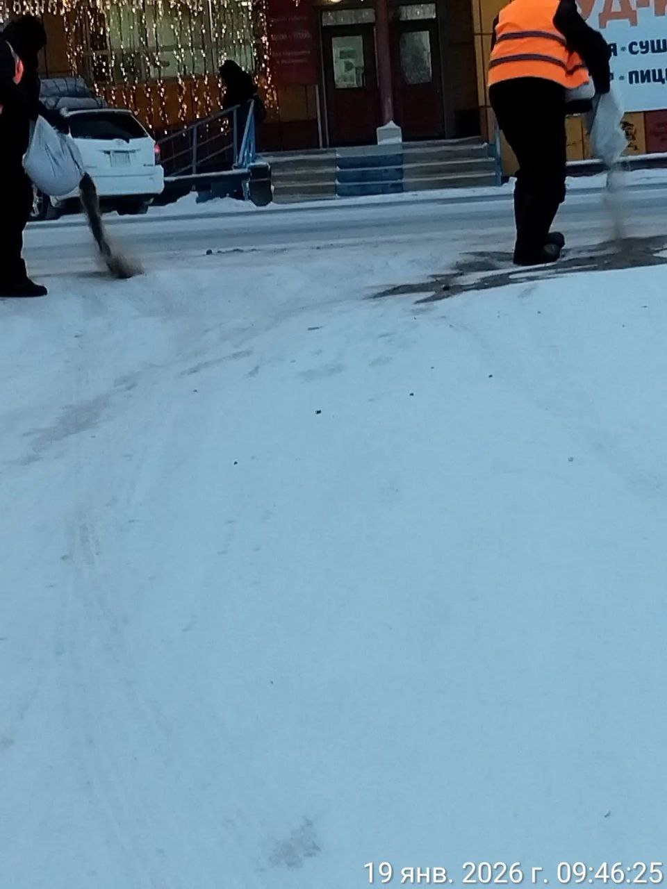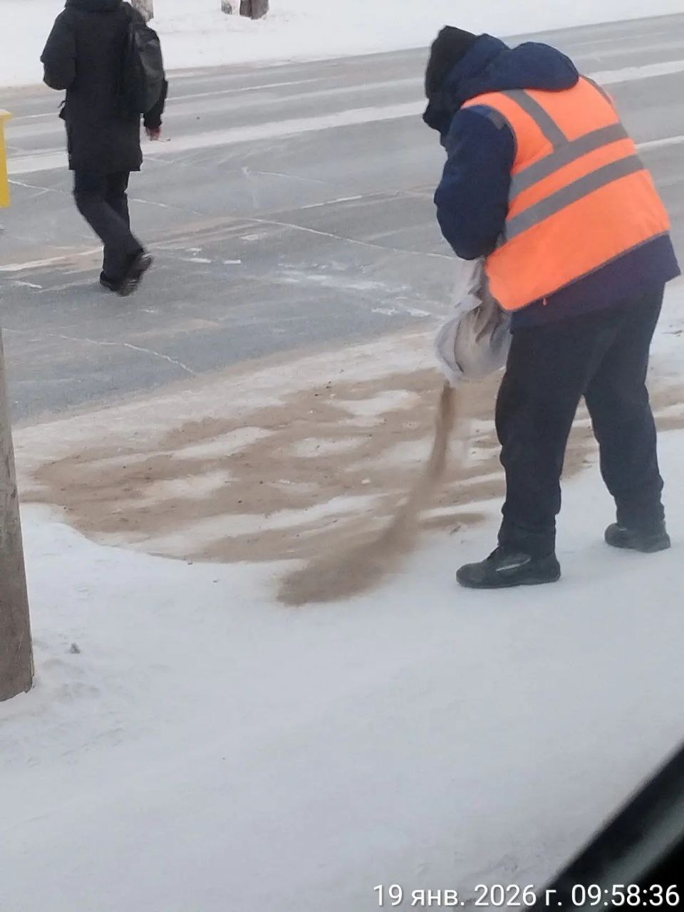 В целях обеспечения безопасности, ежедневно, муниципальными дворниками проводятся антигололедные мероприятия на пешеходных переходах