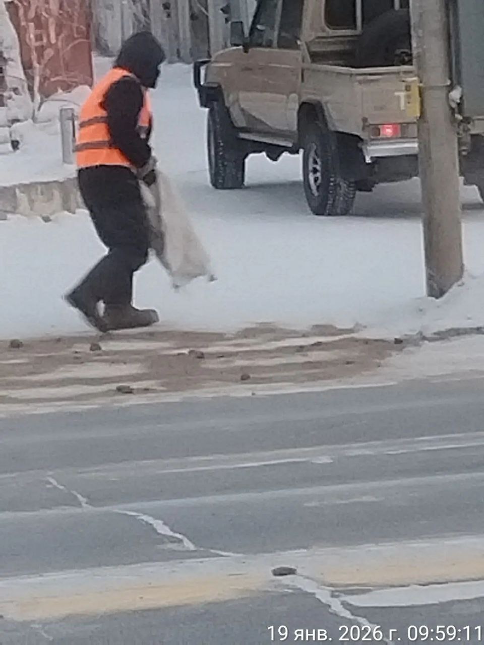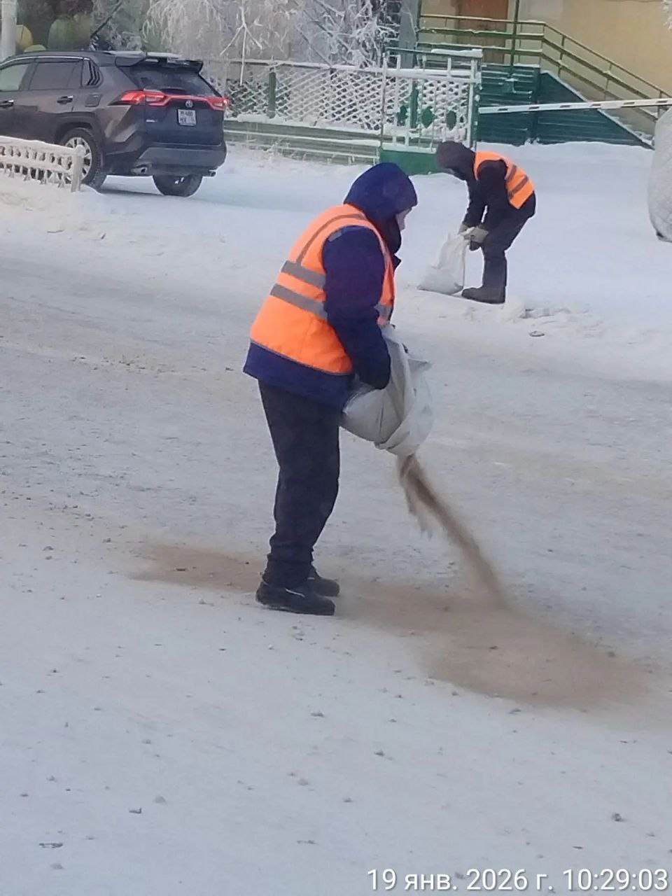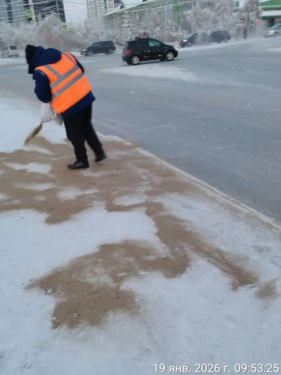 В целях обеспечения безопасности, ежедневно, муниципальными дворниками проводятся антигололедные мероприятия на пешеходных переходах
