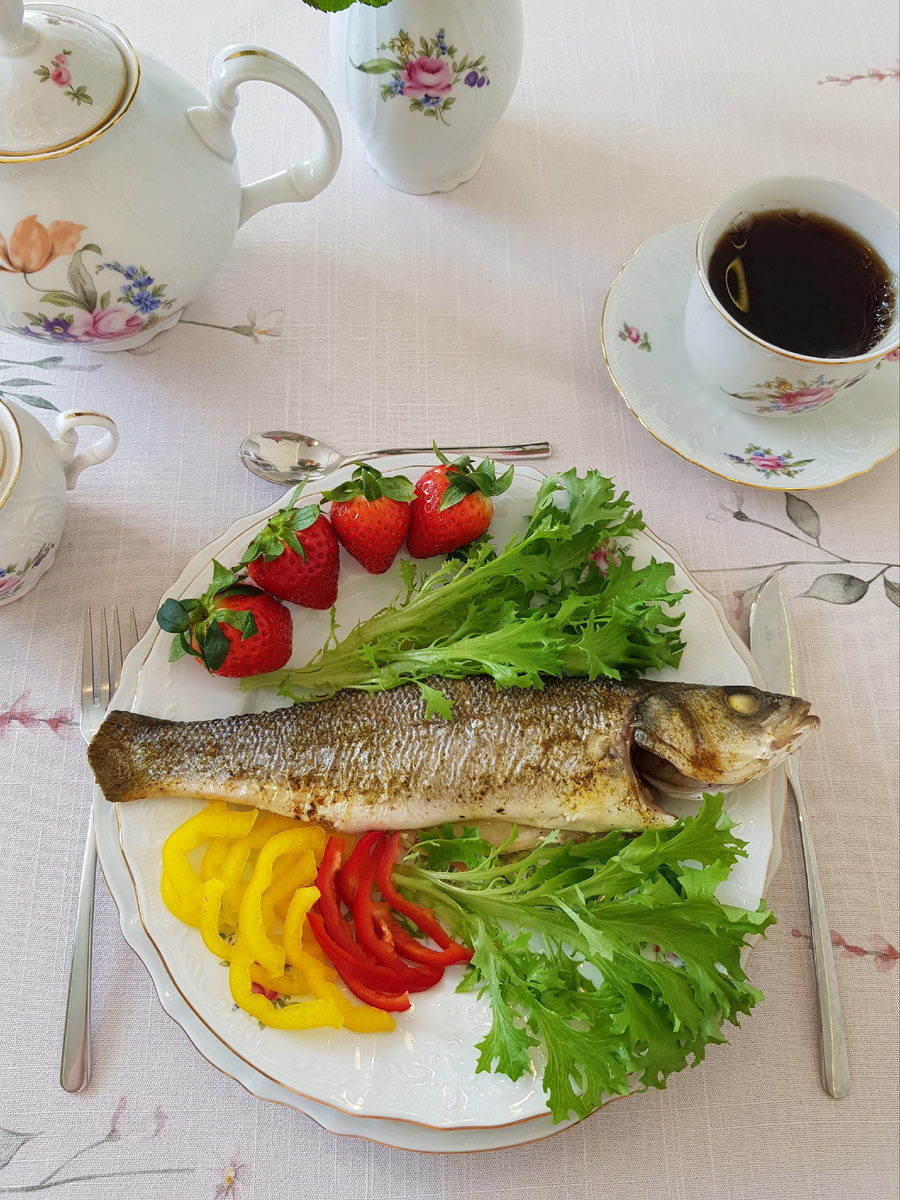 После того как сибасы будут готовы, разложите их по тарелкам и дополните свежими листьями салата, сладким перцем и, если хотите, немного сочной клубники. Это добавит яркости и свежести вашему блюду!