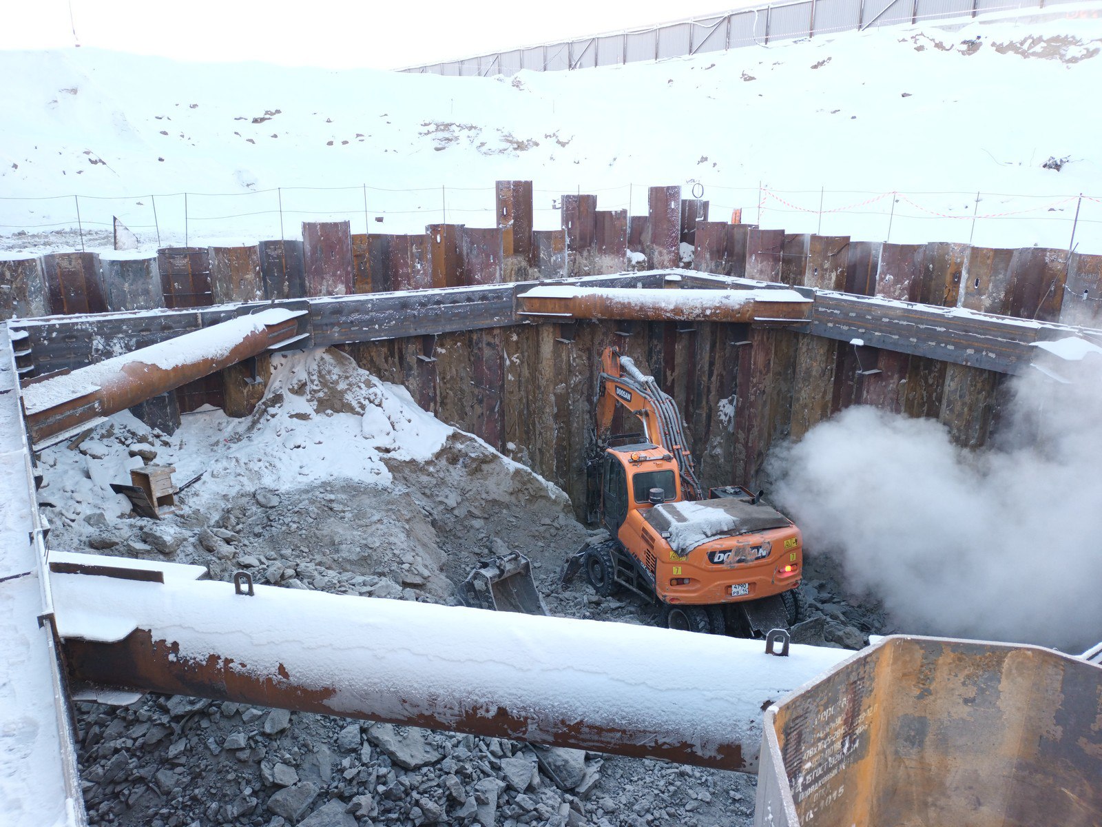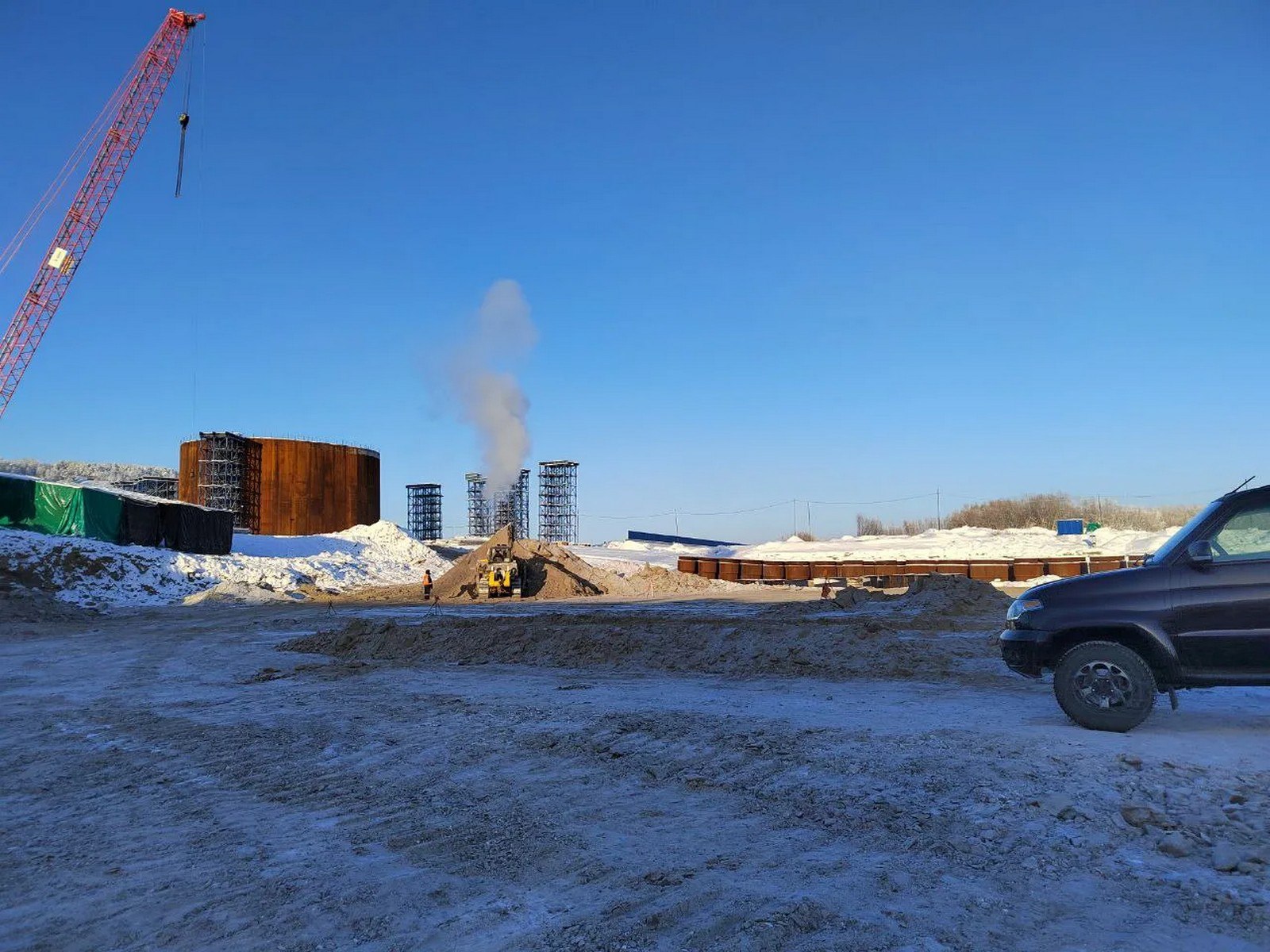 Несмотря на суровую зимнюю погоду, строительные процессы идут согласно графику. При повышении температуры до минус 25 градусов, запланированы буровые работы на правом берегу реки.