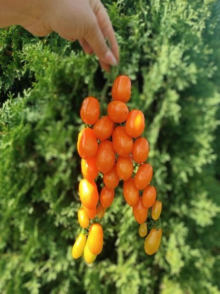 Куст составляет от 50 до 70 см в высоту, что облегчает уход и предотвращает необходимость в сложных опорах. Плоды весом 10-15 граммов формируют аккуратные цилиндрические колечки, созревание которых происходит от зеленоватого до ярко-красного цвета. Уникальный вкус плодов сочетает сладость с нежной кислинкой, что делает их особенно ценными для детского питания и свежих салатов. На вкус напоминают сладкие сливы и изюм, оставляя медовое послевкусие.