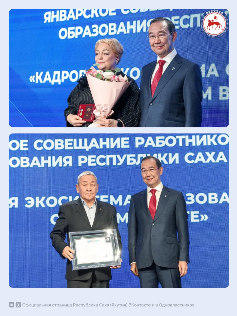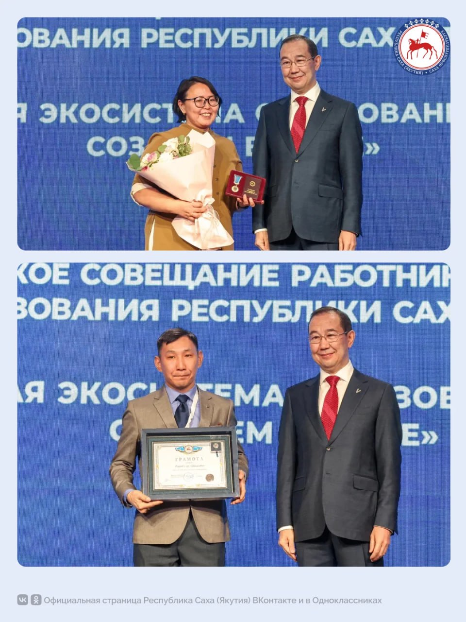 Почётного звания «Заслуженный учитель Республики Саха (Якутия)» удостоена учитель русского языка и литературы Покровской улусной многопрофильной гимназии Хангаласского улуса Жанна Шилова. Знаком отличия «Гражданская доблесть» награждена учитель физики Технического лицея имени Н.А. Алексеевой города Якутска Надежда Тарасова.