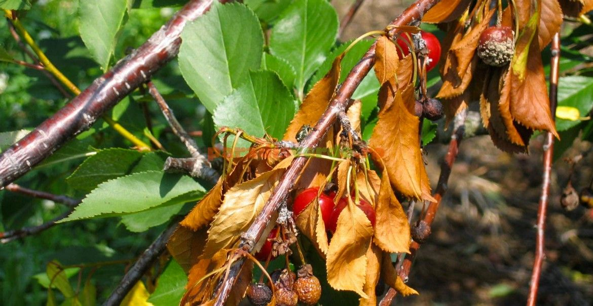- Косточковые (вишня, черешня, слива): Цветы и побеги буреют и усыхают, эта проблема называется монилиальный ожог.
