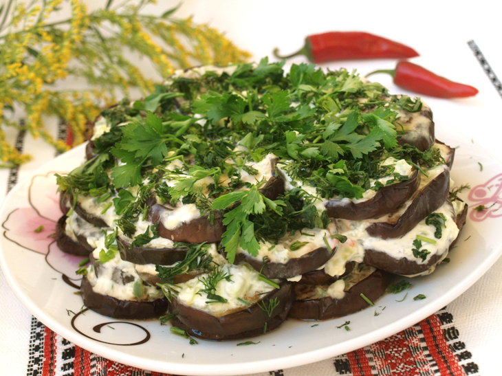 Переходите к сборке закуски. В контейнер или форму с крышкой выкладывайте баклажаны слоями, каждый из которых нужно тщательно смазывать соусом и посыпать зеленью. Плотно утрамбовывайте слои. Закрытый контейнер следует убрать в холодильник минимум на 3-4 часа, чтобы закуска настоялась.