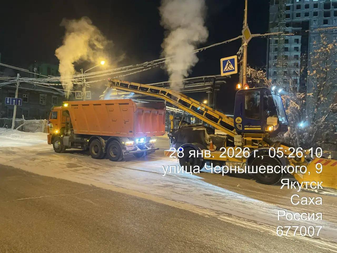 Кадры ночных работ подрядной организации АО "Якутдорстрой" по уборке прибордюрной части дорог.