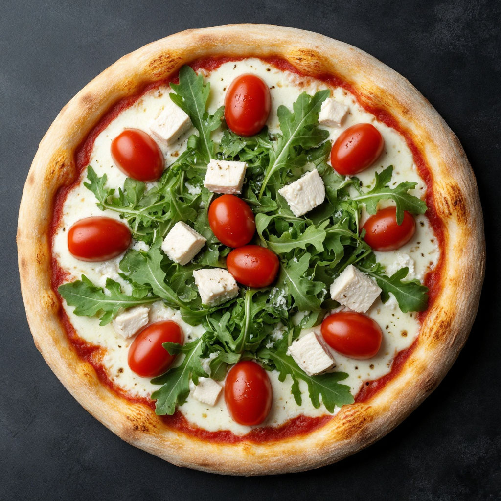 Готовый крем распределяют по тёплой основе, сверху раскладывают помидоры, кусочки курицы и щепотку рукколы. Быстрый и понятный рецепт, который не требует особых кулинарных навыков, но даёт достойный результат для семейного ужина.