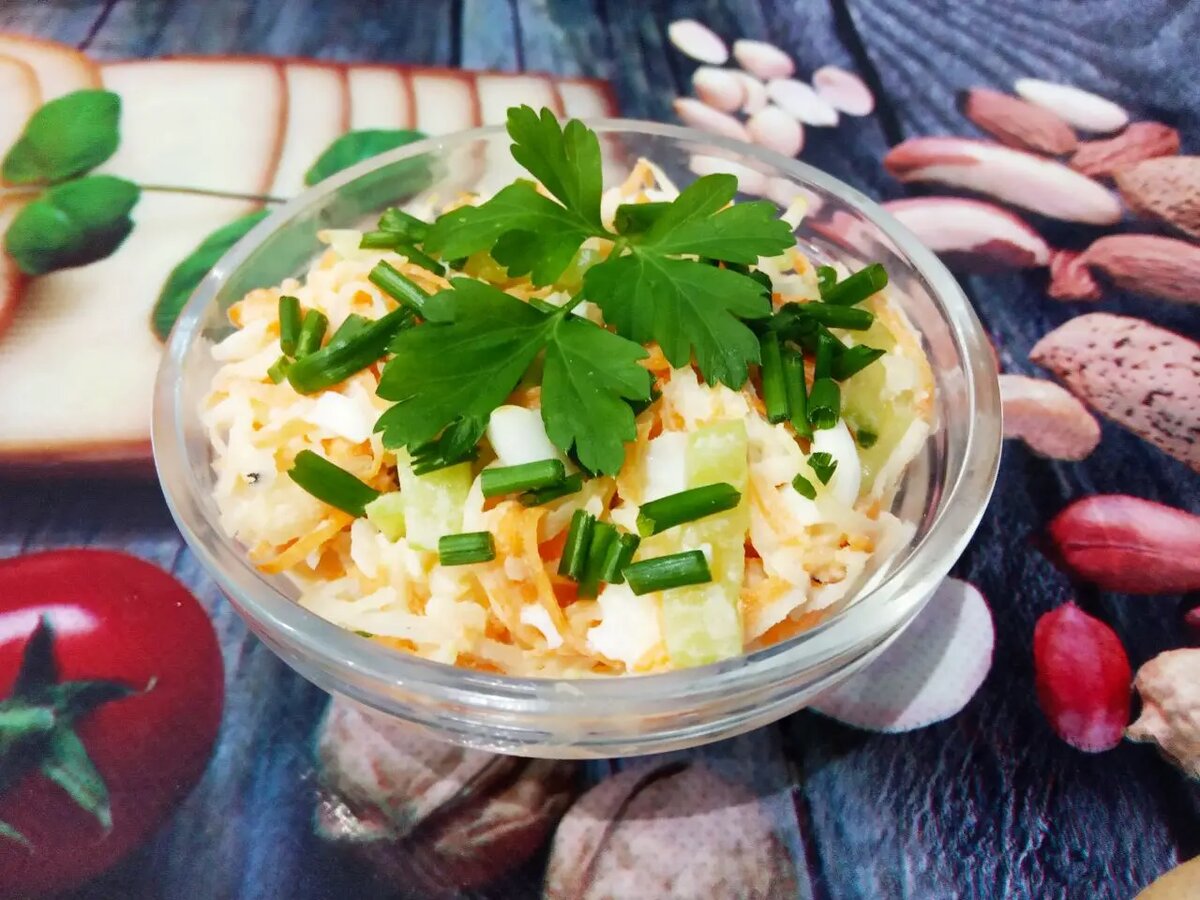 Основной набор — редька, морковь и огурец — дополняется яйцами и зеленью. Терпкость редьки снимается предварительной промывкой и коротким промыванием холодной водой, после чего редьку можно натереть и дать ей немного отдохнуть. Остальные ингредиенты нарезаются или натираются, зелень — мелко, чеснок — по желанию, чтобы аромат был мягким.