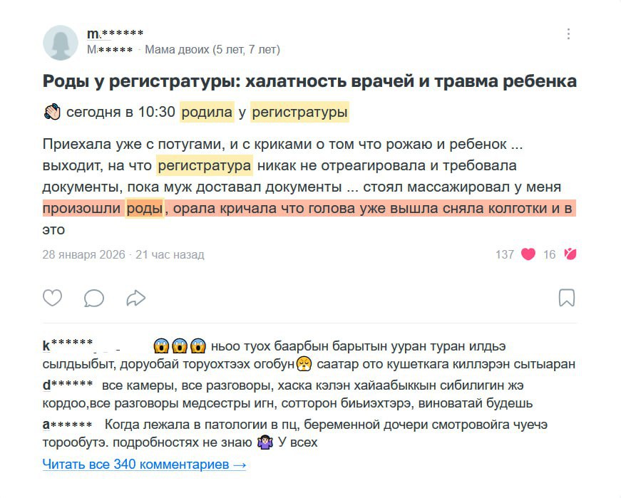 В Якутске вчера женщина родила, стоя у регистратуры медцентра: ребёнок упал на пол и получил травмы, пока у папы требовали заполнить все бумаги.