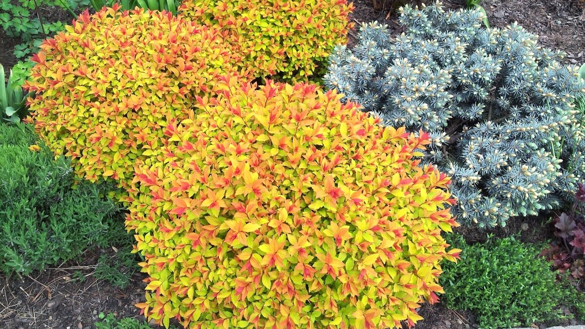 Среди наиболее выносливых кустарников выделяются японские спиреи. Их листву не раз сменяет радуга оттенков: от зеленого и желтого до яркого оранжевого и багряного. Спиреи цветут несколько раз за сезон, включая повторное цветение в конце лета и осенью. Популярностью пользуются сорта «Golden Carpet» и «Goldflame». Первые имеют компактную золотистую форму, а вторые достигают высоты до 80 см, радуя глаз объемной кроной.