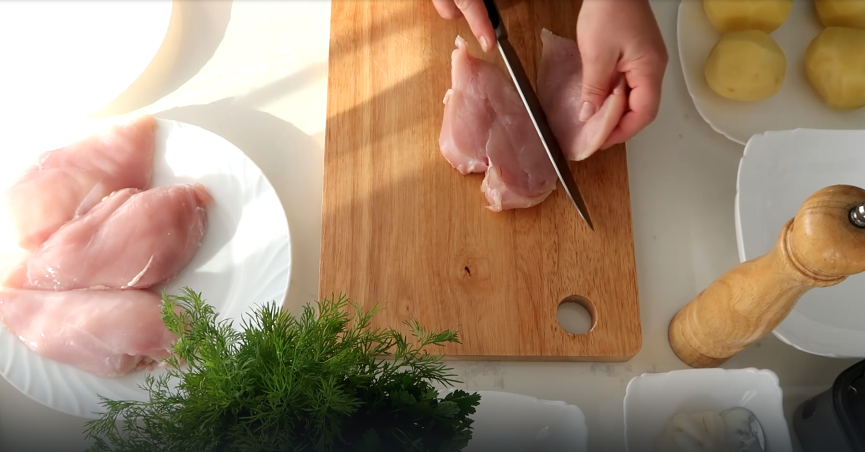 Куриное филе тщательно моется и обсушивается, после чего его разрезают вдоль на две части. Затем, накрыв пленкой, мясо аккуратно отбивается до желаемой толщины и приправляется солью и перцем.