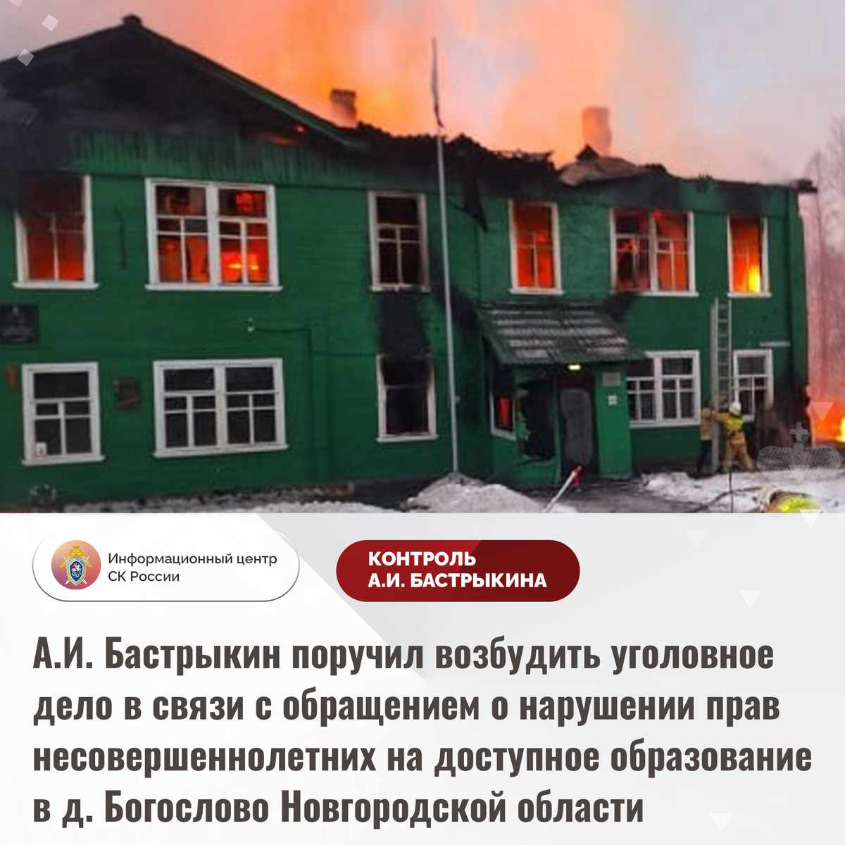 После обращения Бастрыкин поручил начальнику СУ СК России по Новгородской области, Николаю Супруну, инициировать уголовное дело, чтобы тщательно изучить обстоятельства произошедшего. Контроль над выполнением этого поручения и ход процессуальной проверки будет осуществляться на уровне центрального аппарата ведомства.