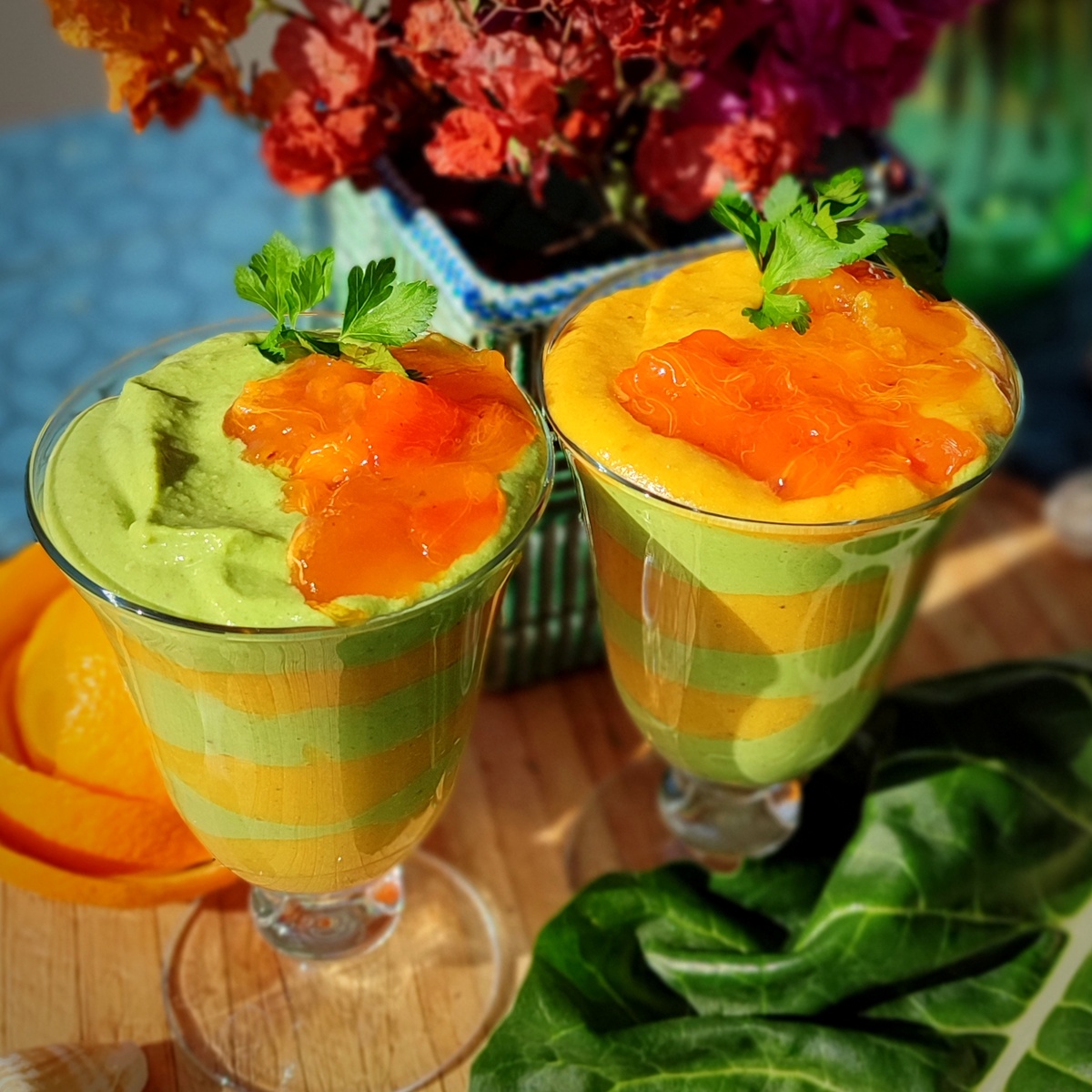 Оранжевая часть: Затем в том же блендере смешать оставшиеся ингредиенты, исключая хурму. После этого аккуратно поочередно выкладывать слои смузи в бокалы, используя ложку для удобства. Завершить композицию можно украшением из мягкой хурмы сверху.