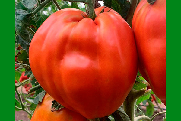 Это индетерминантный сорт, достигающий до двух метров в высоту. Редкие листья позволяют краще освещать плоды, а кисти на стебле дают плодоношение до сорока помидоров на растении. Плоды мясистые, конфигурация варьирует от сливовидной до сердцевидной, масса колеблется от 300 г до 1 кг. Кожица плотная, семена почти отсутствуют, что облегчает консервирование и хранение.