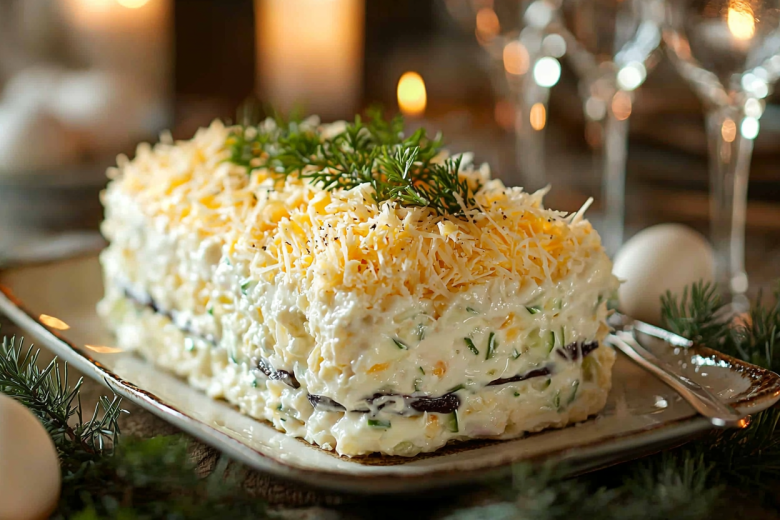 Каждый слой следует немного промазывать майонезом для лучшего сцепления ингредиентов. Завершает композицию обильное посыпание тертыми белками, создавая эффект снежного покрова. Для имитации коры березы на поверхности выкладываются полоски чернослива.