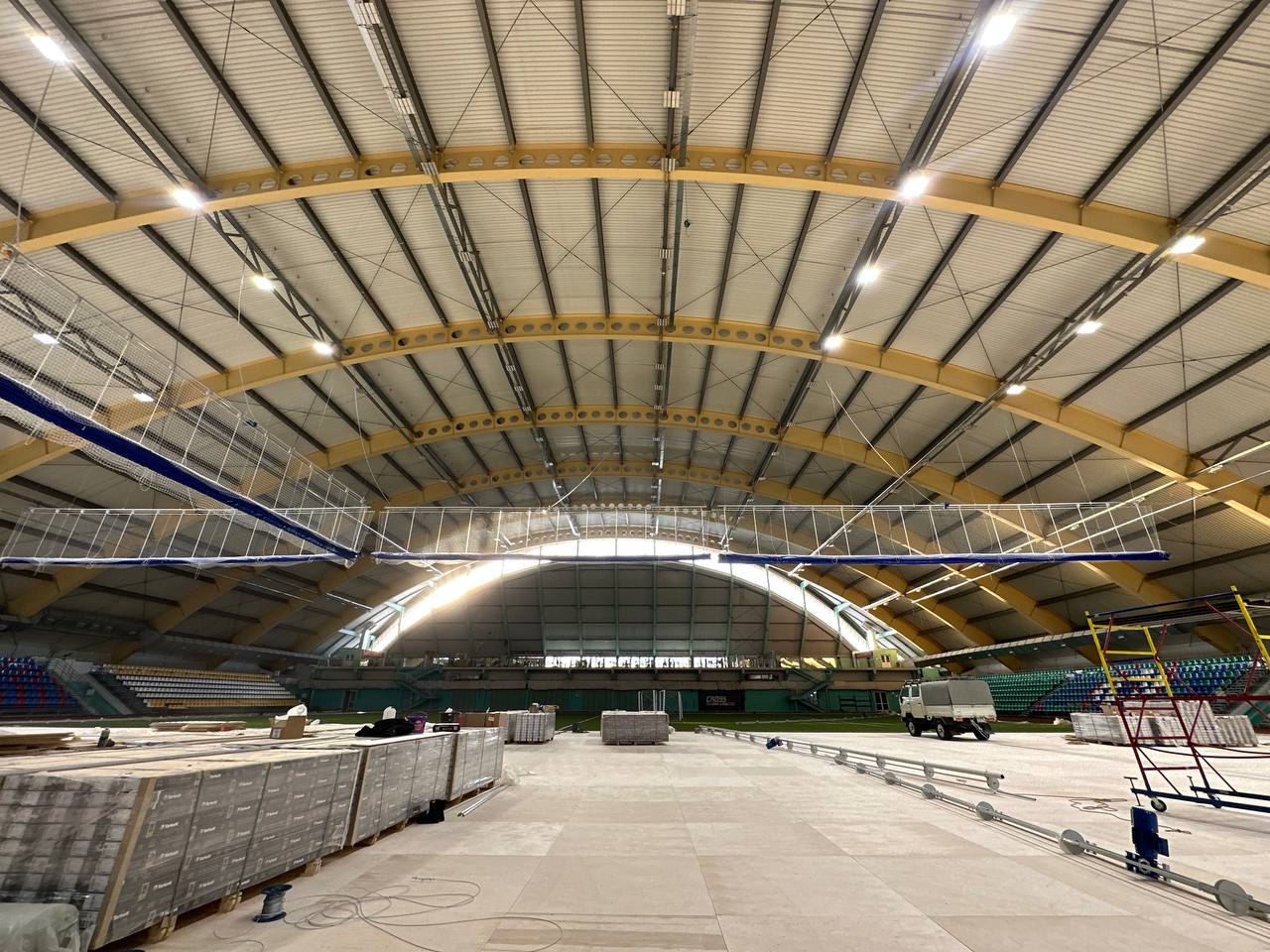 Готовность спорткомплекса сегодня составляет 80%. Идут монтажные работы по устройству современных паркетных площадок для волейбола, футбола и баскетбола, устанавливаются перегородки для зонирования пространства скейтбордной и тренажерной площадок. Обустраивается беговая дорожка. Все работы идут в хорошем темпе и в соответствии с графиком.