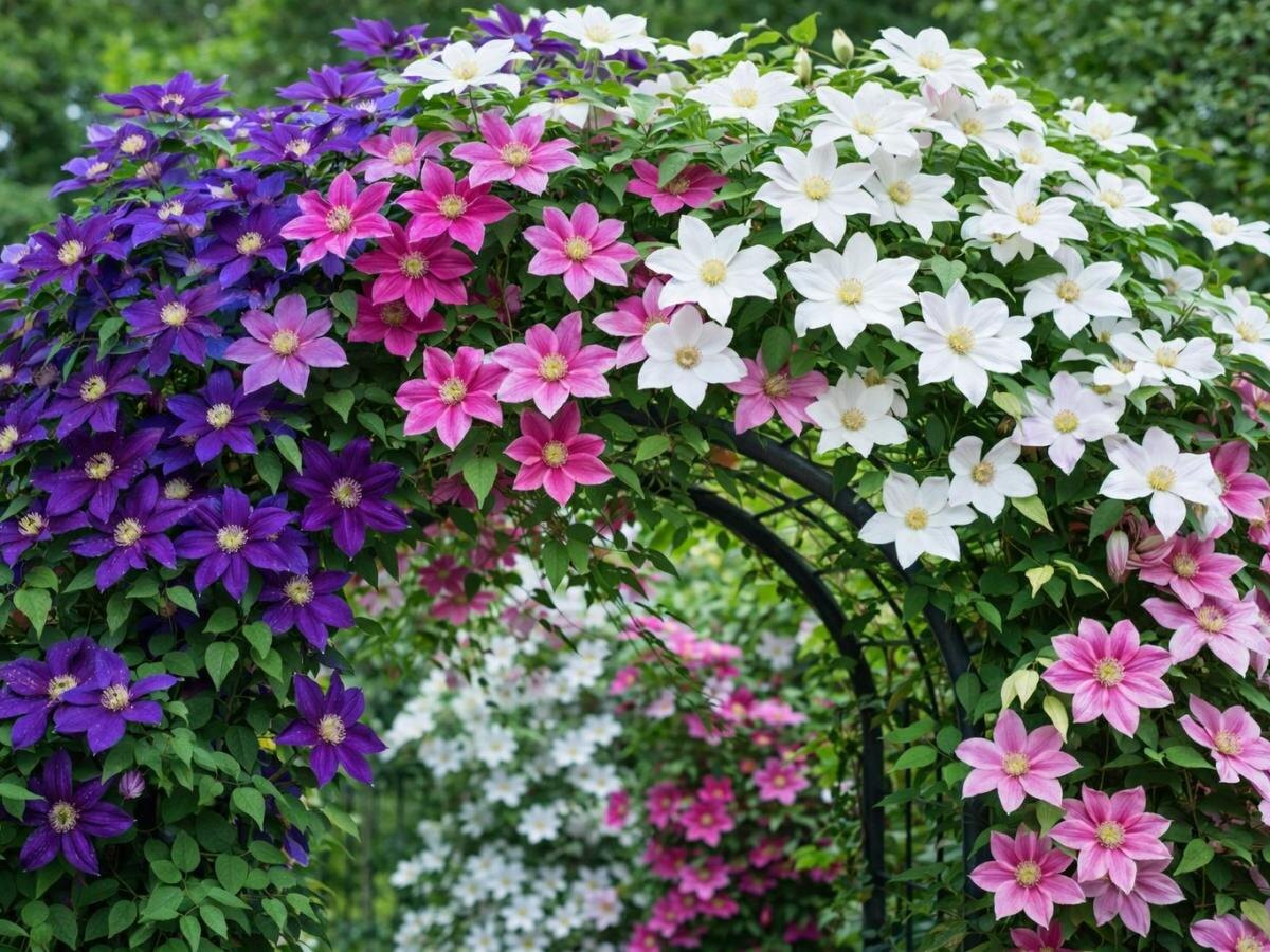 Выбирая между клематисом, жимолостью и плетистой розой, стоит учитывать задачи озеленения; клематис станет отличным выбором для создания ярких цветочных акцентов.