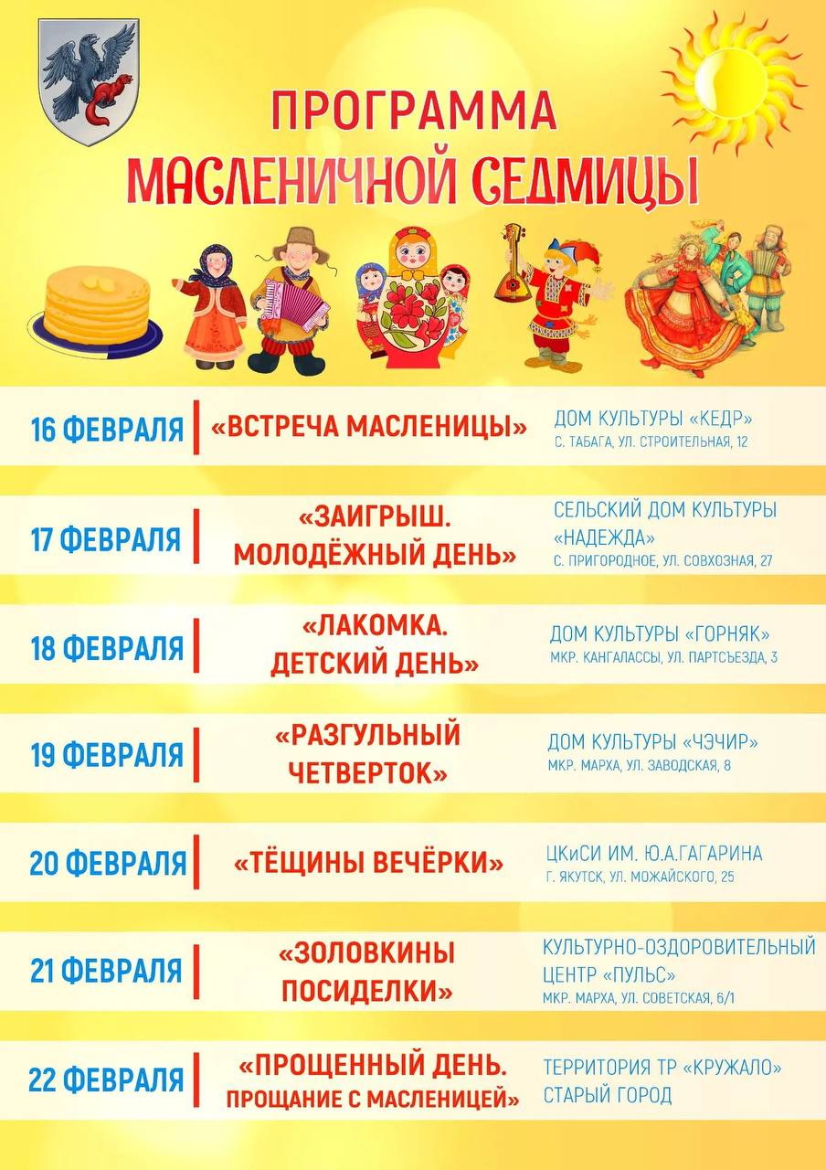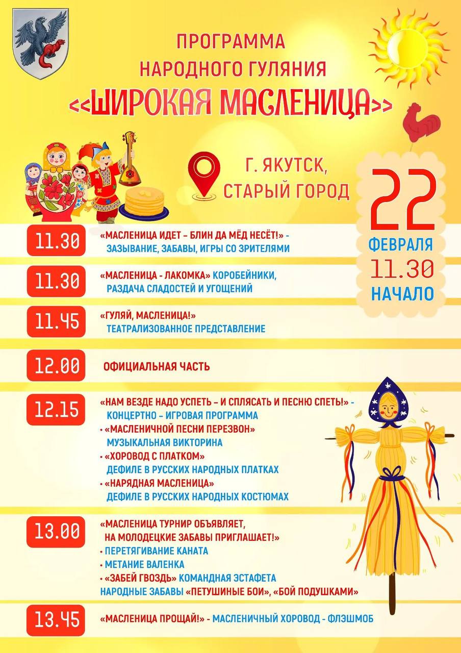 Мэрия Якутска опубликовала программу празднования Масленицы: Седмица начинается 16 февраля, а в воскресенье, 22 февраля, состоится ключевое празднование в Старом городе.