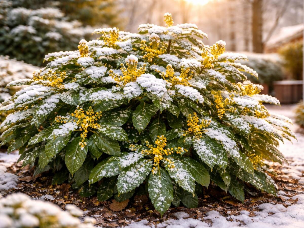 Композиции из компактных кустарников также могут стать ярким акцентом зимнего сада. Например, кизильник горизонтальный с мелкими листьями сохраняет свою зелень даже при -20 °C. Бересклет Форчуна радует глаз аккуратными стелющимися побегами, а магония падуболистная восхищает тёмно-зелеными листьями, которые в морозы окрашиваются в бордовый.
