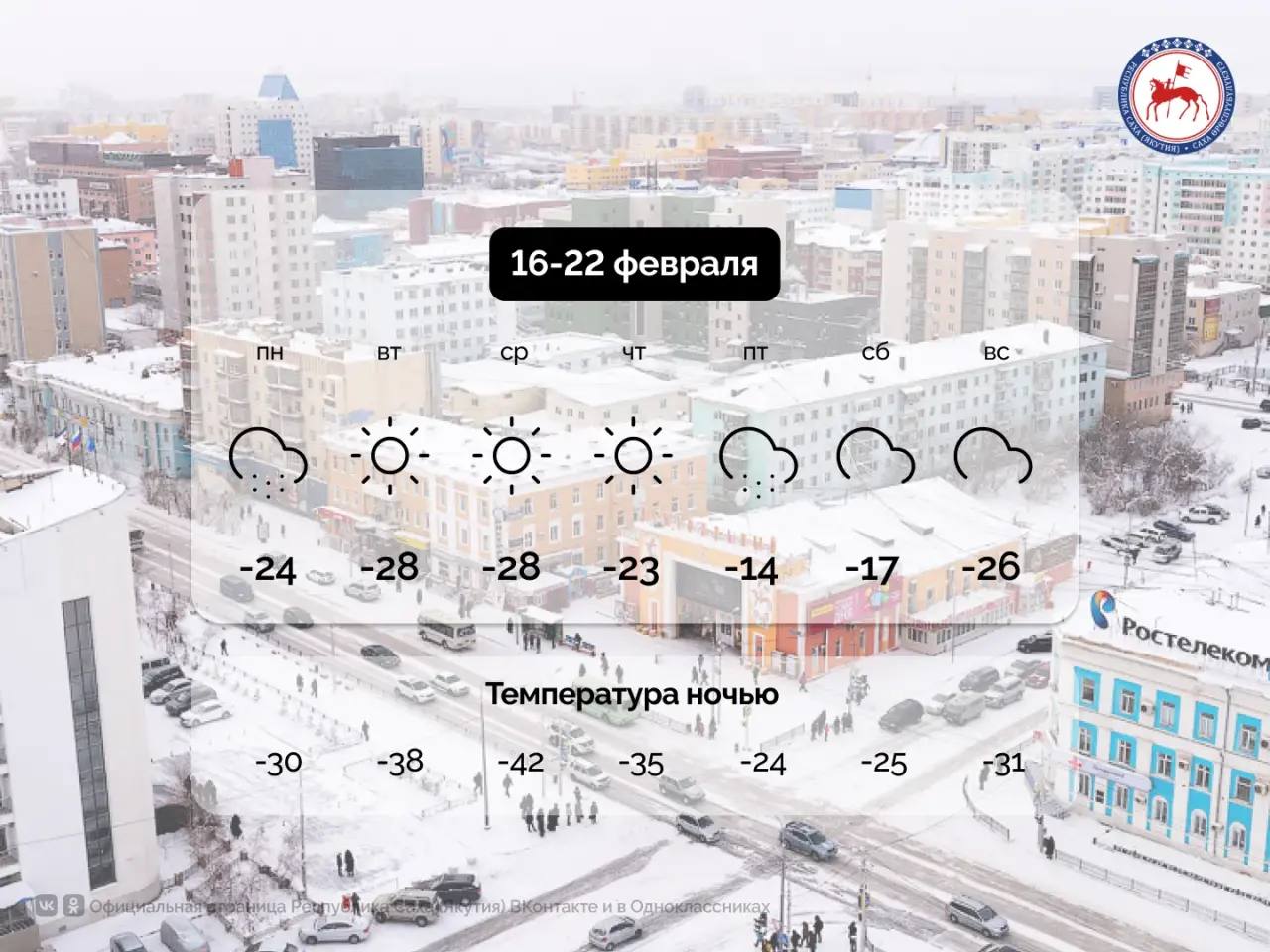 Согласно прогнозу Росгидромет, в период со 16 по 22 февраля в столице республики, Якутске, преимущественно облачно.