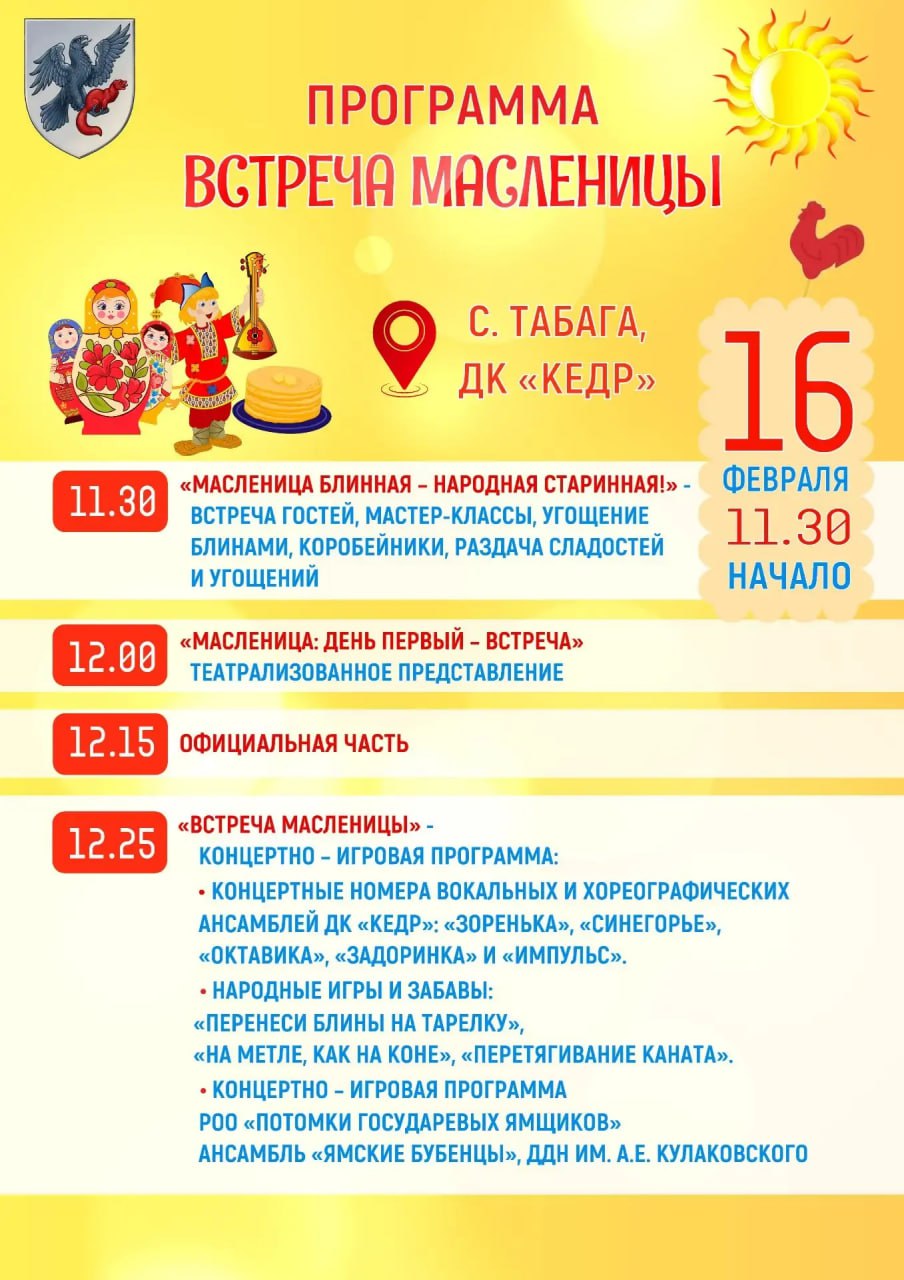 Сегодня, 16 февраля, в селе Табага начнётся «Встреча Масленицы». Участников праздника ждут театральное представление, концертные номера ансамблей «Зоренька», «Синегорье», «Октавика», «Задоринка» и «Импульс», а также народные забавы: «Перенеси блины на тарелку», «На метле, как на коне» и «Перетягивание каната».