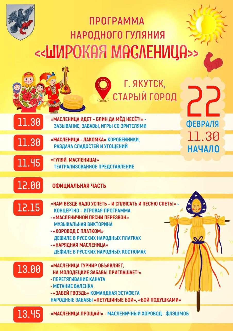 Как сообщили организаторы недели, с 16 по 22 февраля в Якутске и ближайших микрорайонах состоится Масленичная неделя с тематическими днями, народными играми, концертами и обязательными блинами.
