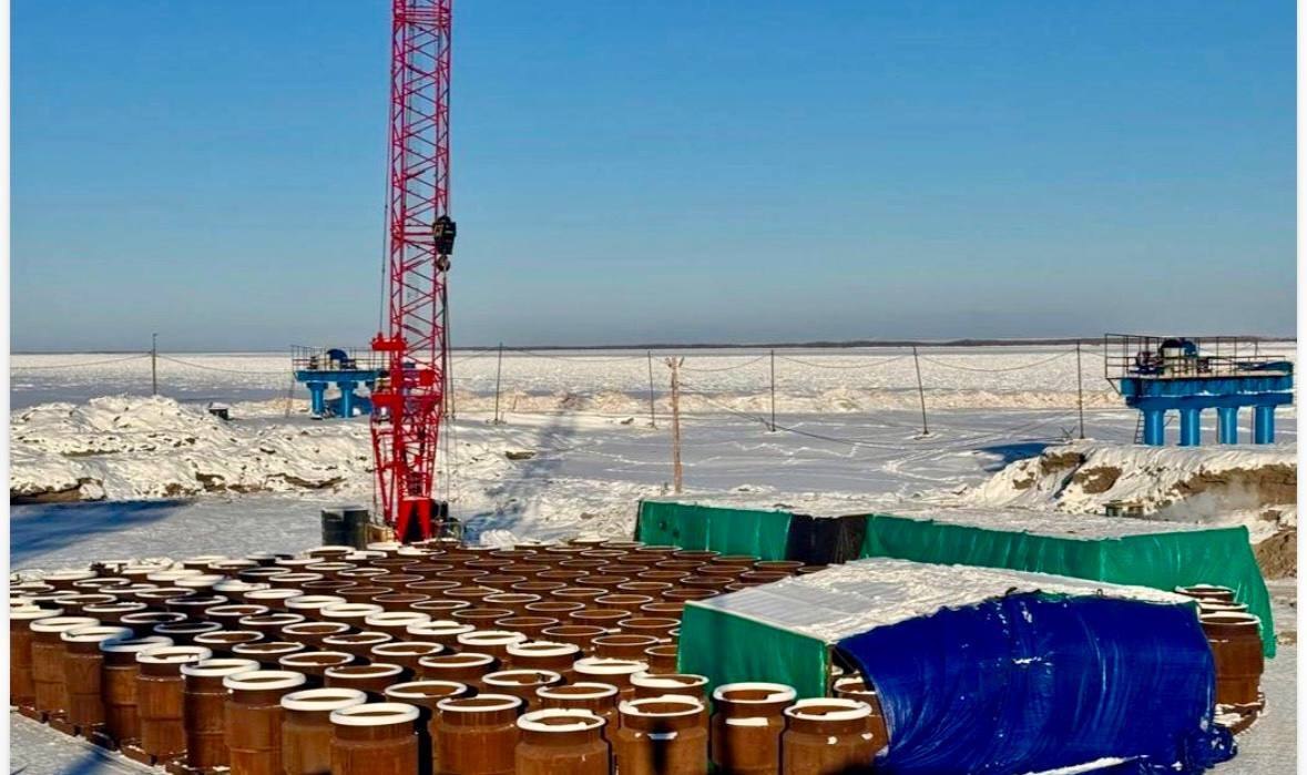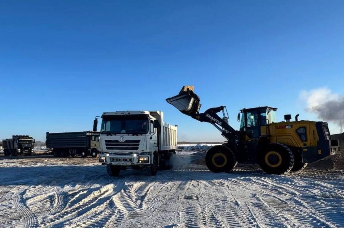 На площадке строительства Ленского моста разворачивается работа в русловой части для строительства мостового перехода через реку Лену в Якутии.