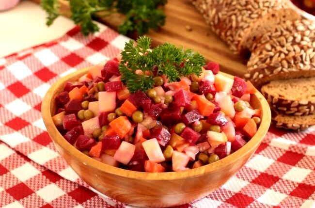 Основу классического винегрета составляют свекла, морковь и картофель. Правильная заправка из растительного масла, соли, перца, уксуса и горчицы акцентирует вкус овощей, не подавляя их натуральный аромат.